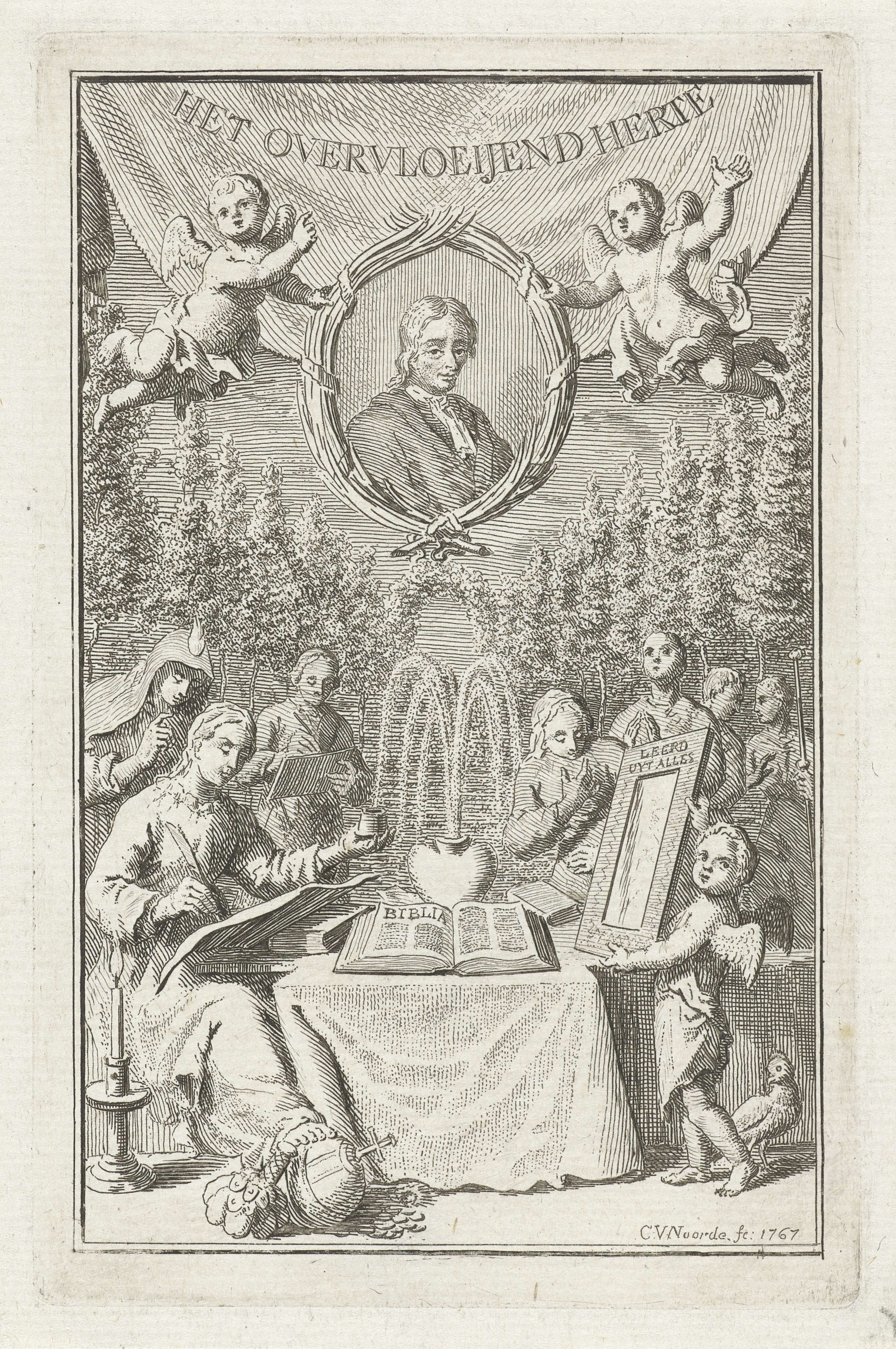 Allegorische voorstelling over de goede en goddelijke dingen, die het hart laten overstromen. Een overvloeiend hart als een fontein staat met een opengeslagen bijbel op een tafel. Aan weerszijden van de tafel staan Godsdienst met een vlam op het hoofd, een kaars, die zorgt voor licht, de Eenvoud, die een spiegel toont met de tekst: ...