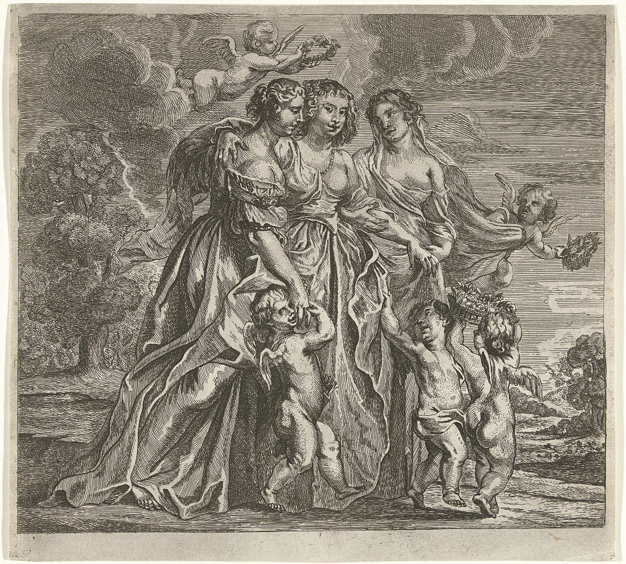 De drie gratiën vergezeld van vijf putti waarvan één met een bloemenmand en twee met bloemenkransen.