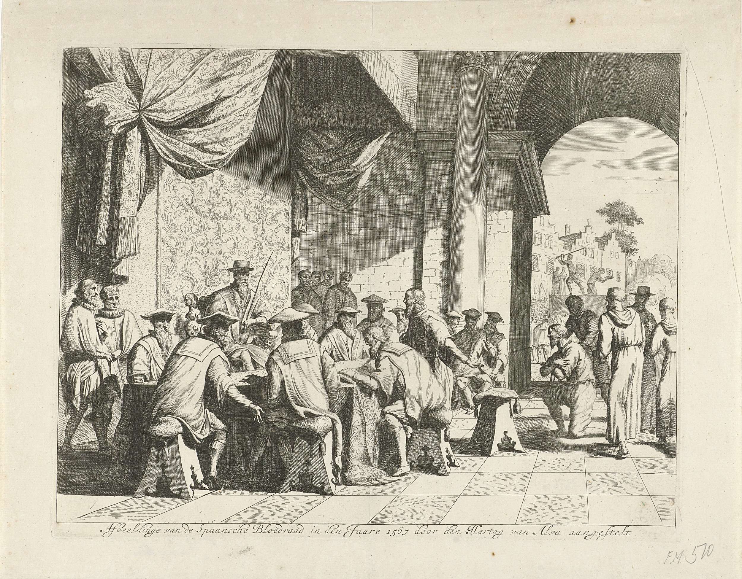Zitting van de Raad van Beroerten, bijgenaamd de Bloedraad, voorgezeten door de hertog van Alva gezeten op een troon met de gerechtsroede in de hand, 1567. In een open hof zit Alva op een troon achter een grote tafel waaraan zijn raadsheren. Een man knielt voor de raad neer. Rechtsachter wordt een man onthoofd.