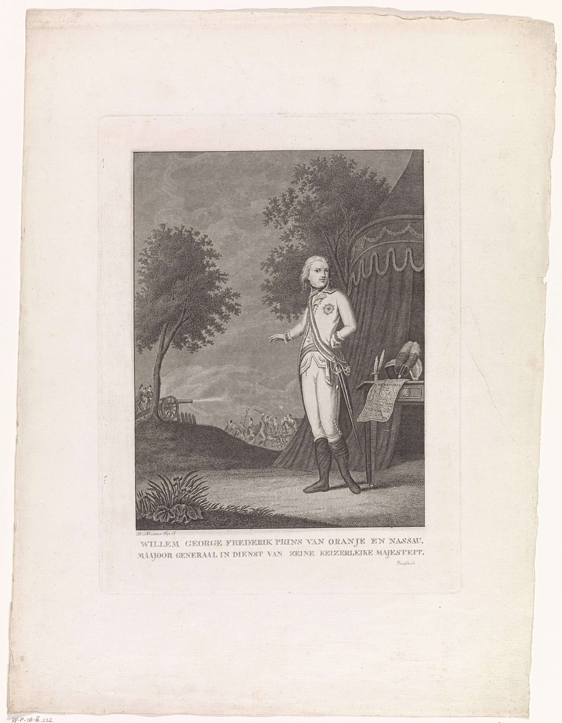 Portret van Willem George Frederik, prins van Oranje-Nassau, staande voor zijn legertent. Op de achtergrond wordt slag geleverd.