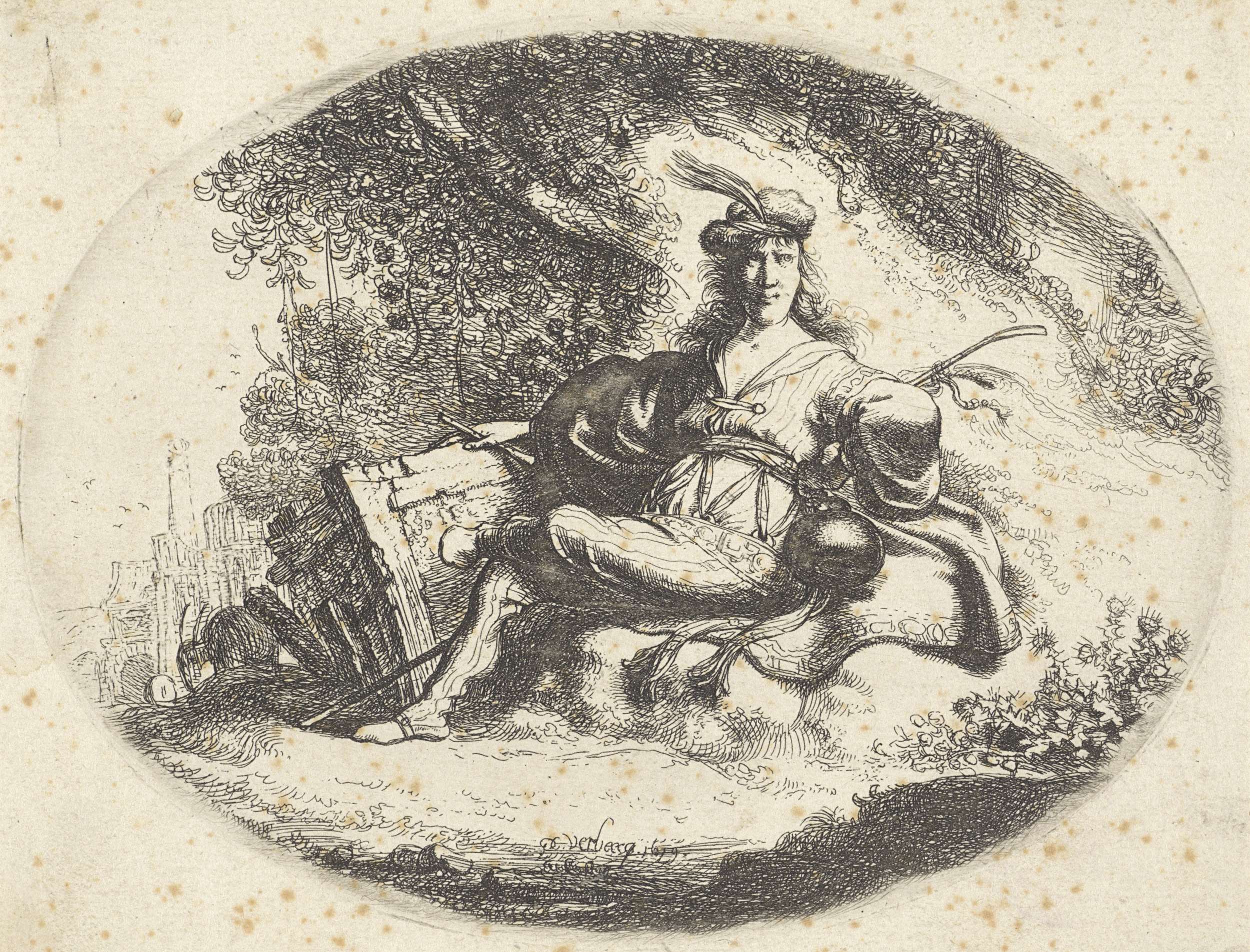 Een herder zit aan de voet van een boom. Links op de achtergrond huizen.