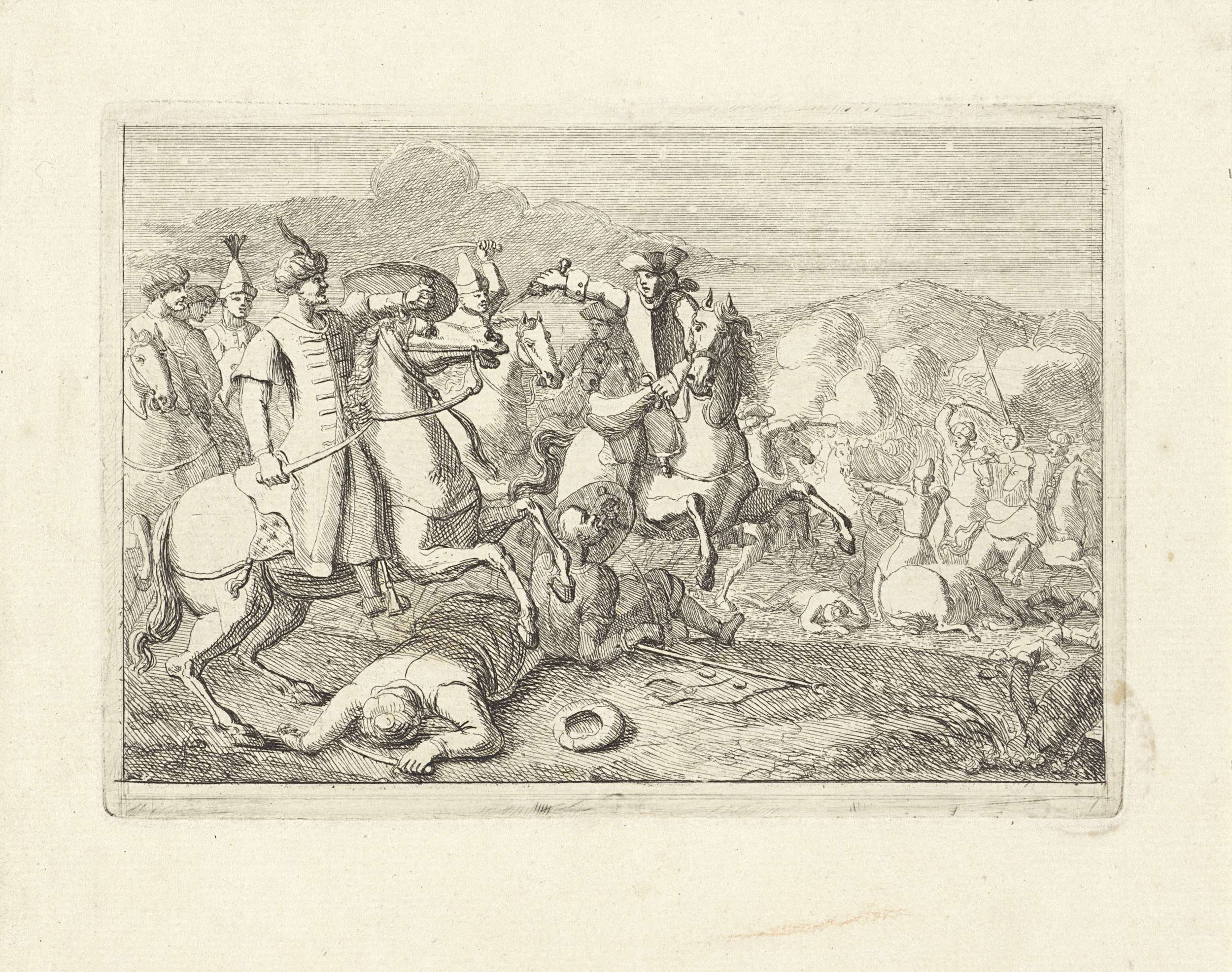Een ruiter met een pistool is in gevecht met Oosterse ruiters met tulbanden, met zwaarden. Op de grond gewonde figuren en op de achtergrond meer vechtende ruiters.