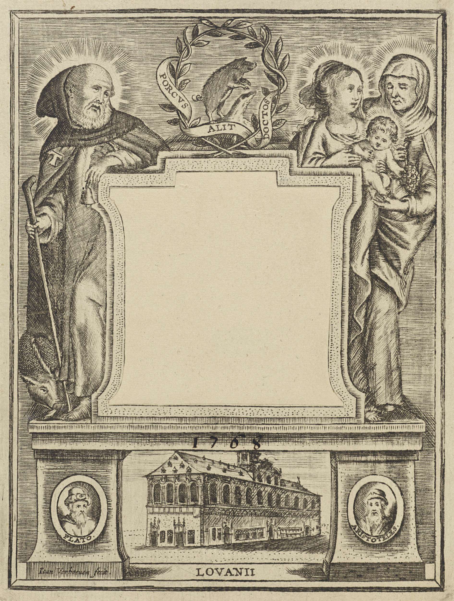 De heilige Antonius met bel, staf en varken, en Anna te Drieëen flankeren een leeg cartouche. Onderaan een gebouw te Leuven, met aan weerszijden de portretten van Plato en Aristoteles.