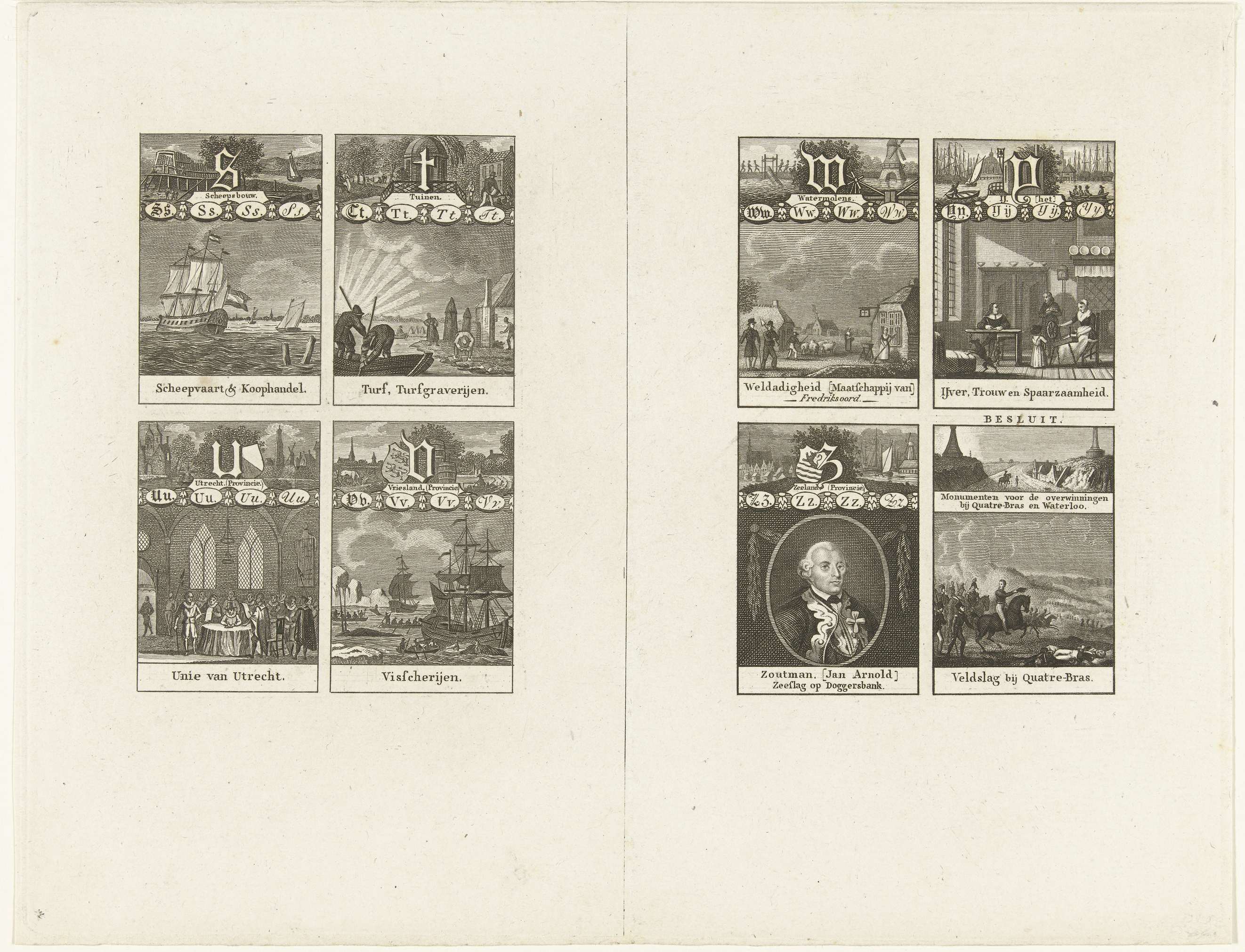 Blad voor de letters S: Scheepvaart en Koophandel, T: Turf en turfgraverijen, U: Unie van Utrecht, V: Visserij, W: Maatschappij van Weldadigheid, IJ: IJver, Trouw en Spaarzaamheid, Z: Jan Arnold Zoutman en de Slag bij de Doggersbank. Bij Besluit: Veldslag bij Quatre-Bras en Waterloo.