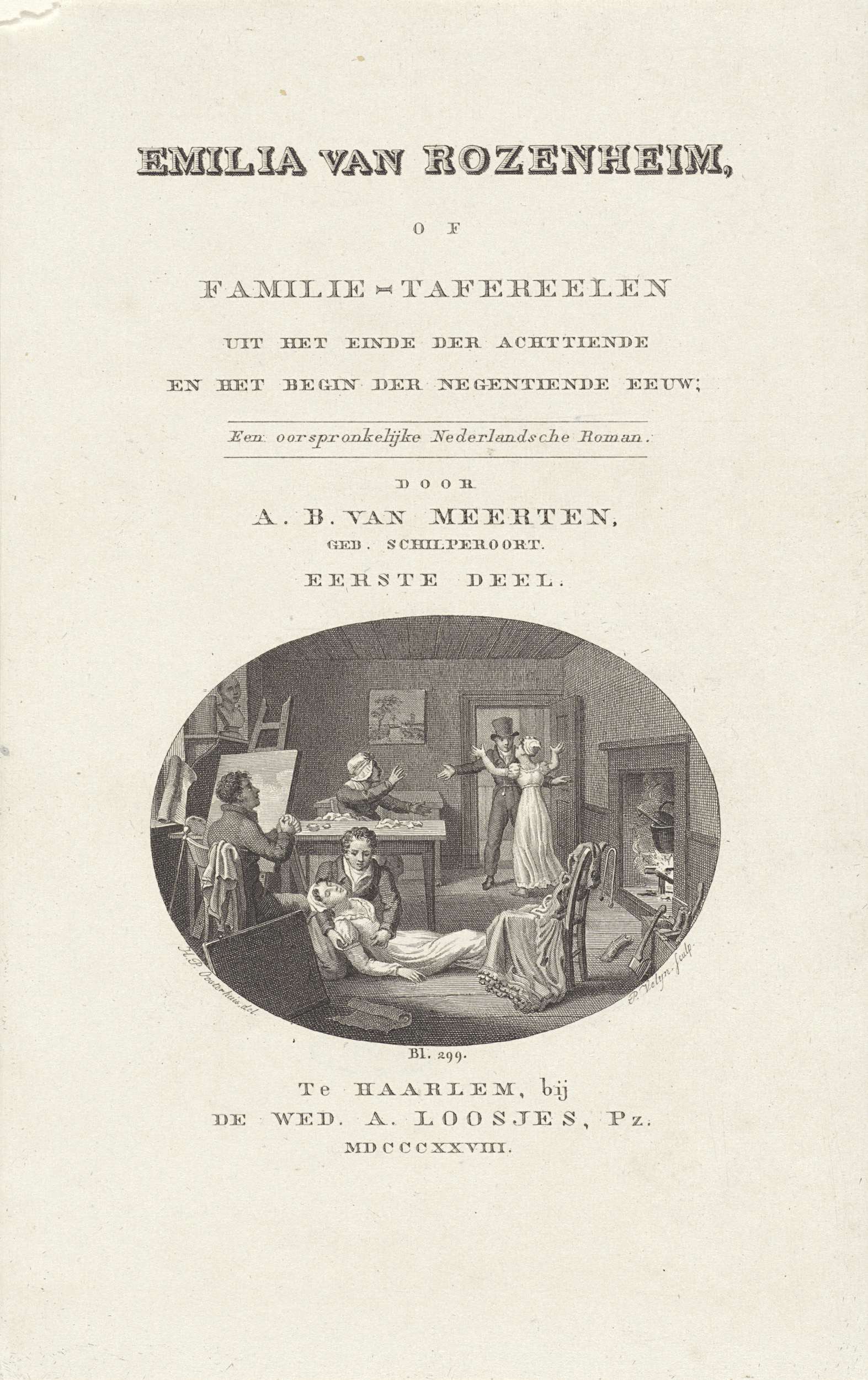 Een man met gespreide armen staat in een deuropening en wordt begroet door een vrouw en twee figuren bij tafel. Op de voorgrond is een vrouw flauw gevallen.