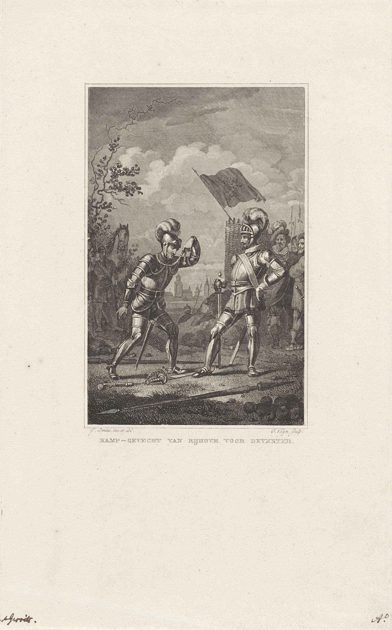 Lodewijk van der Kethulle, heer van Ryhove, verslaat de Spaanse ruiter (de Albanees) in een tweegevecht, buiten Deventer, 1591. De verslagen Spanjaard geeft de overwinnaar zijn gouden ketting.