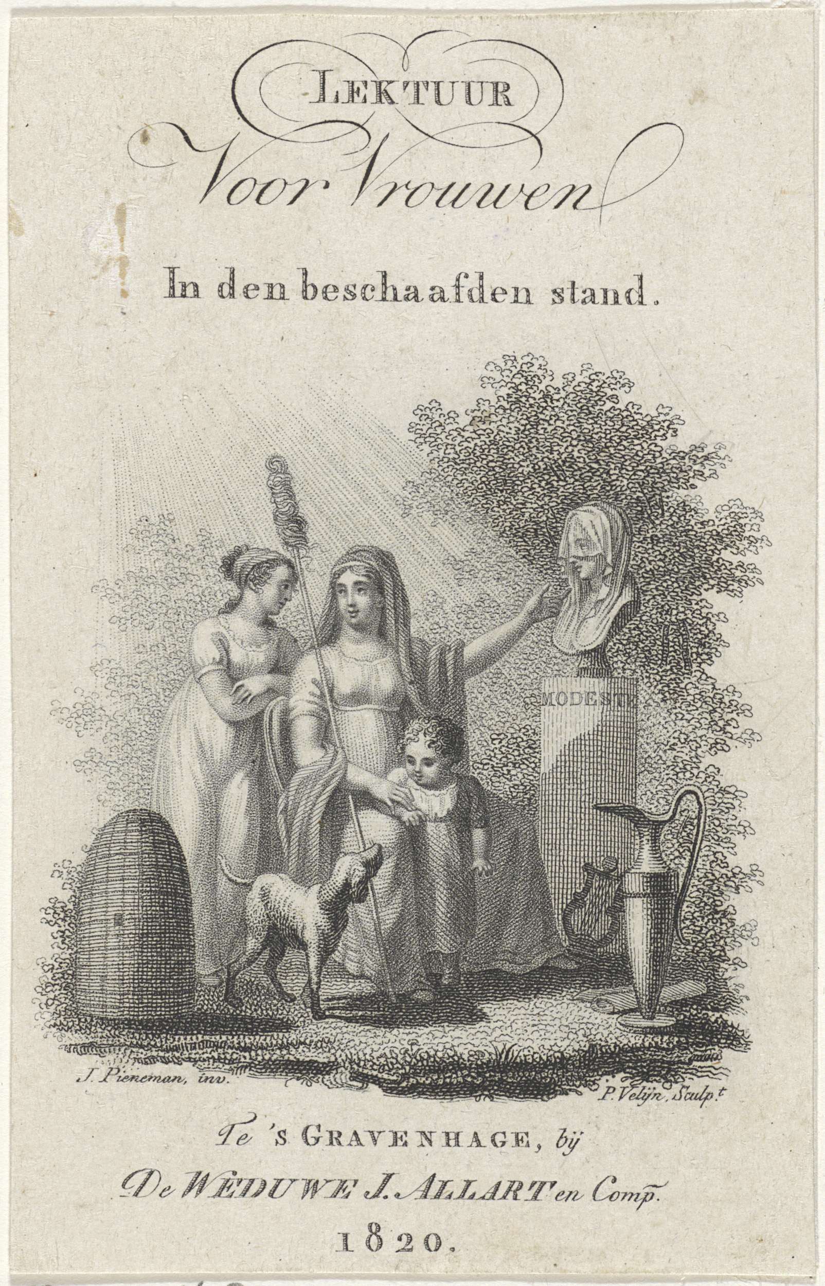 Drie generaties vrouwen bij een buste van een gesluierde vrouw op een sokkel, waarop de tekst: modeste. Rechts op de voorgrond een schenkkan en links een bijenkorf. Aan de voeten van de zittende vrouw een hond en tegen de sokkel van het beeld rust een lier. De vrouw heeft een spinrok vast.