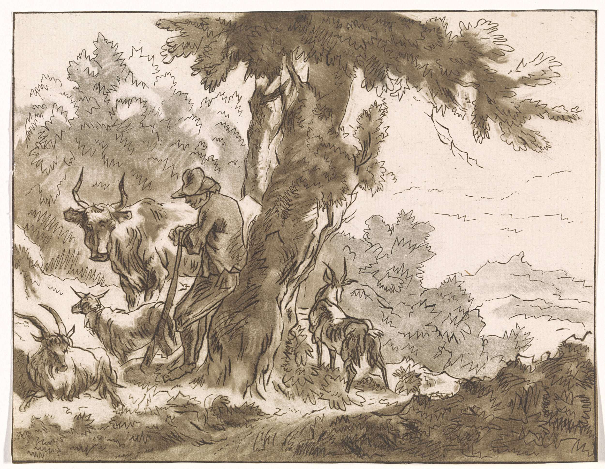 Herder en zijn vee bij een boom