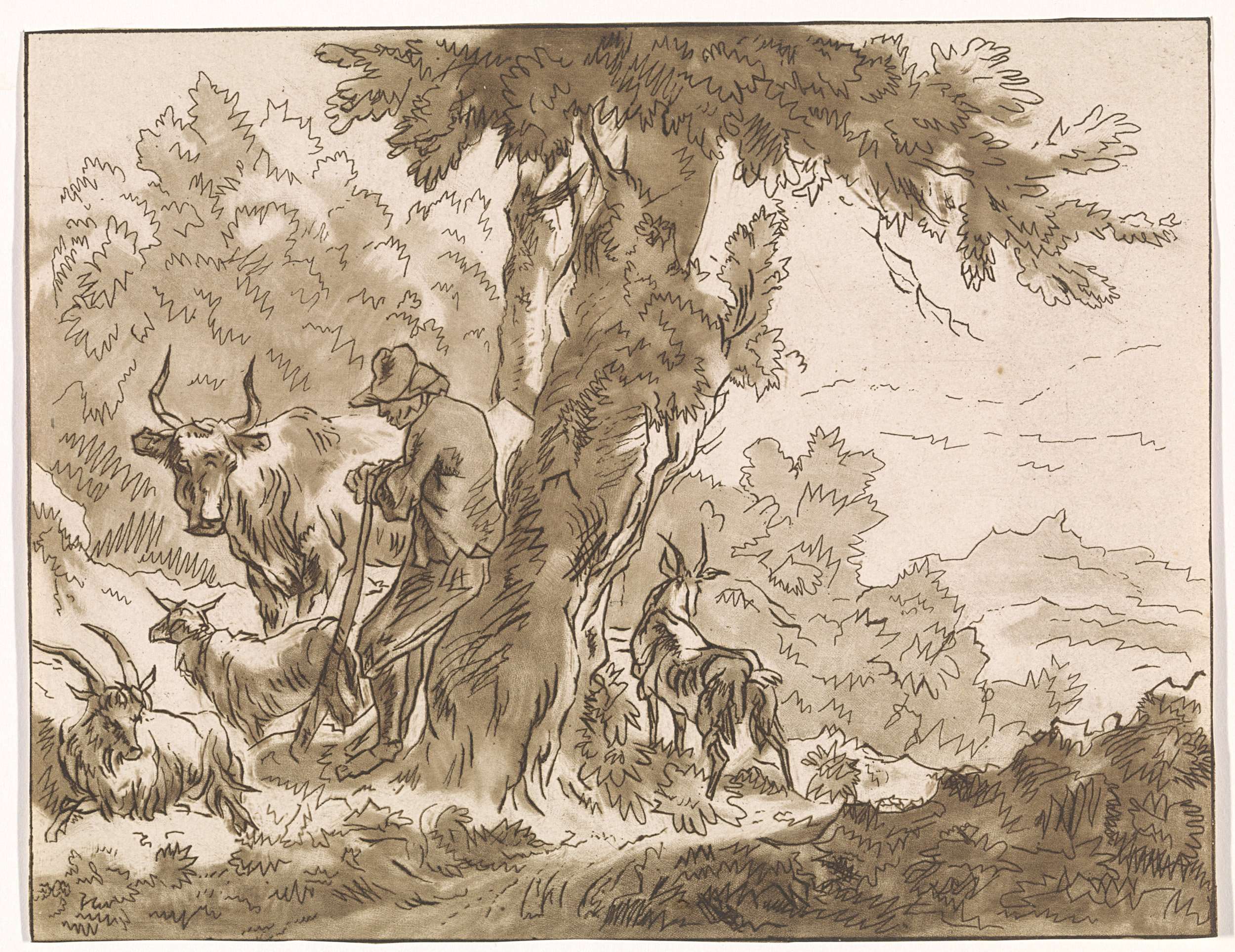 Herder die tegen een boom leunt, om hem heen staat zijn vee.