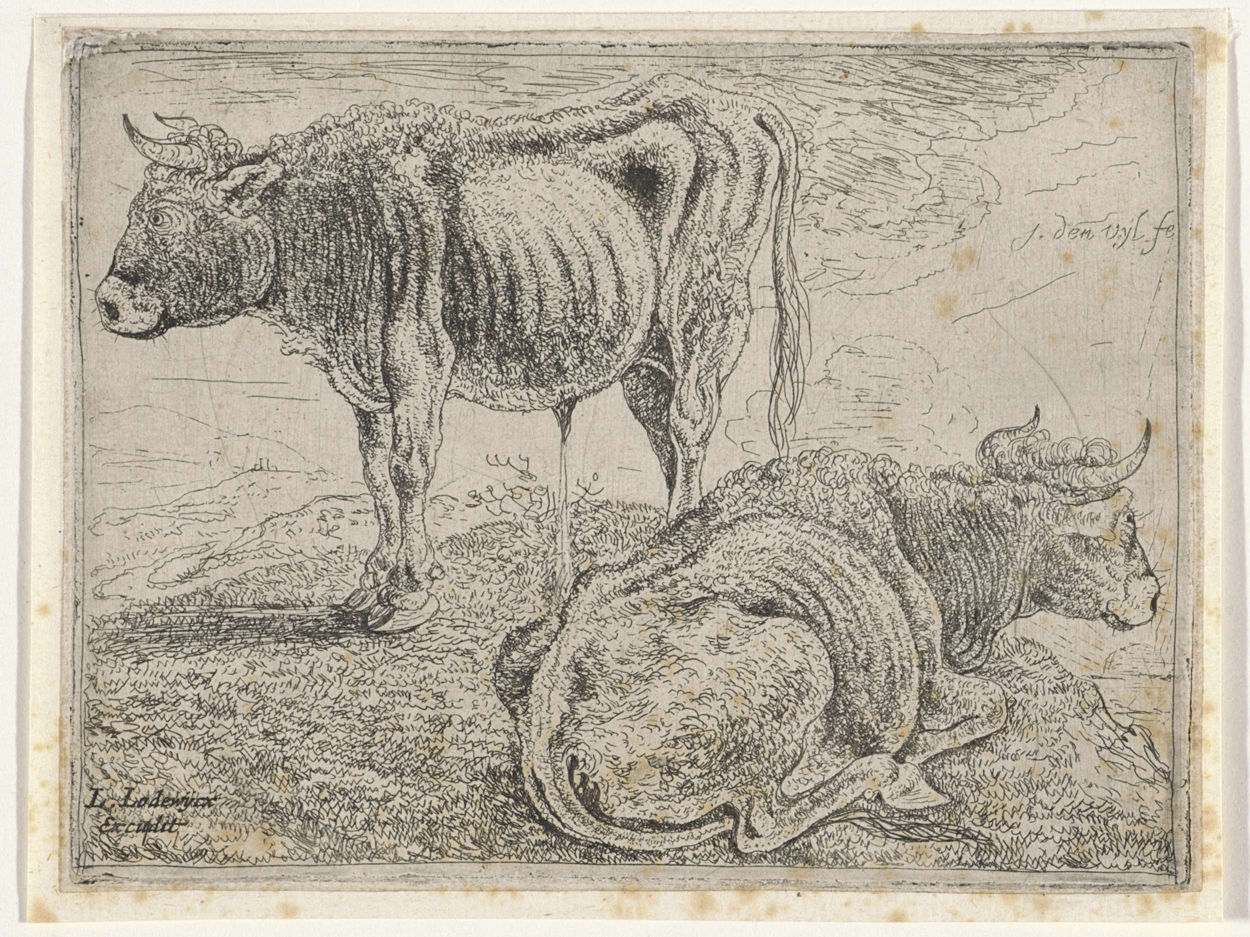 Een staande en een liggende os in een landschap; rechts in de achtergrond een opkomende zon.