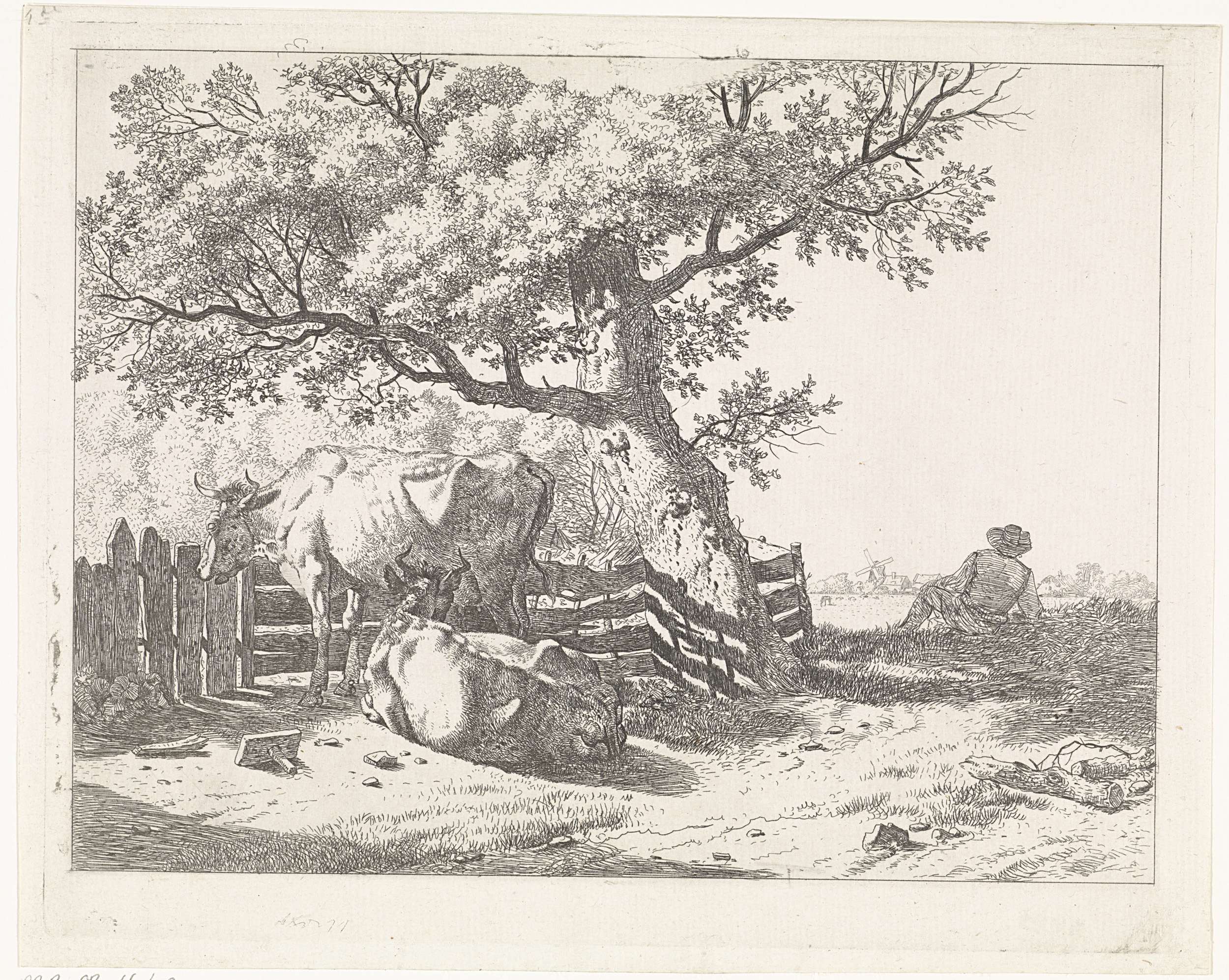 Twee koeien bij een hek naast een boom. Rechts zit een man, op de rug gezien, in het gras.