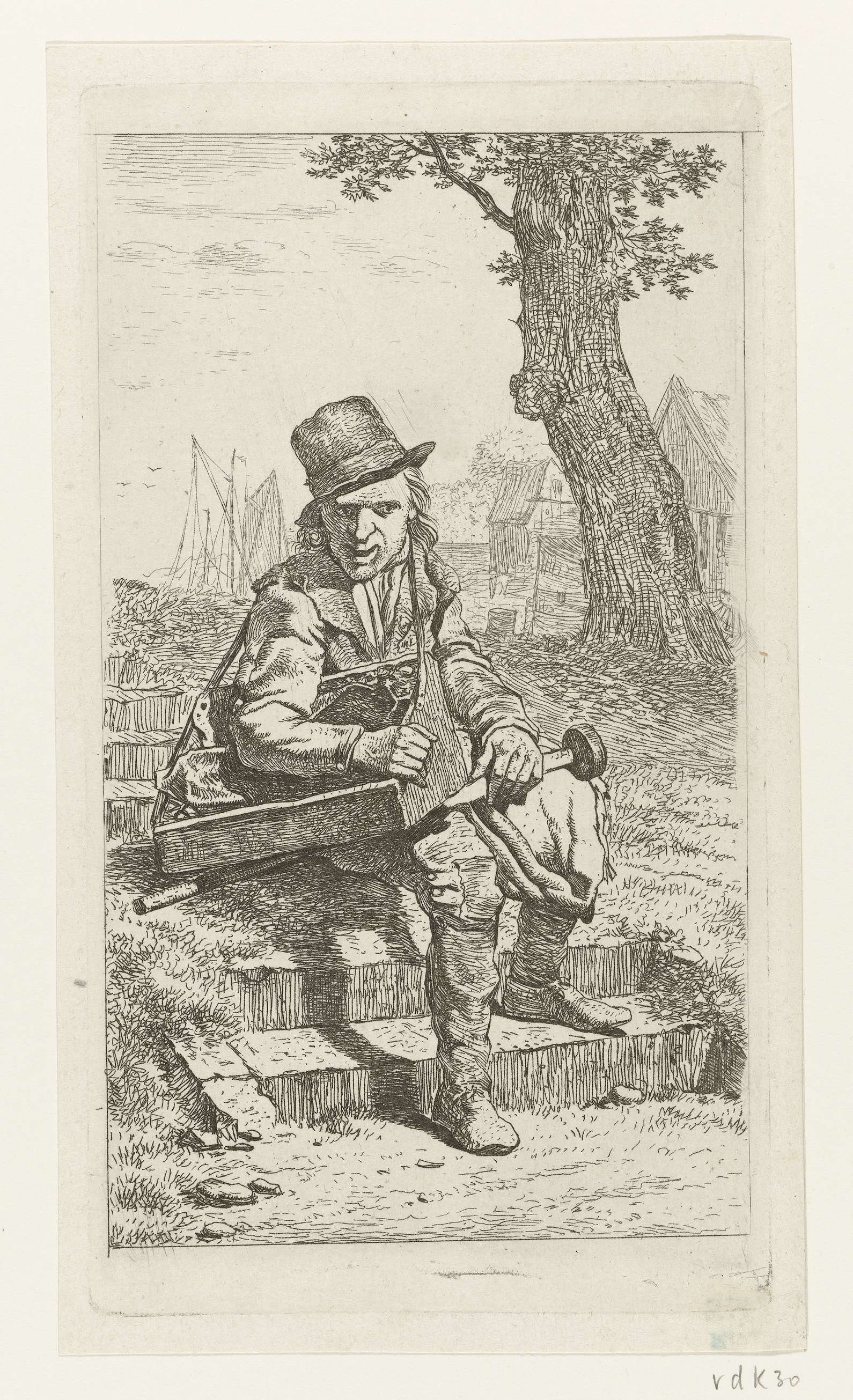 Een marskramer, genaamd Mal Jantje, zit met zijn kist over zijn schouder op het trapje van een dijk.