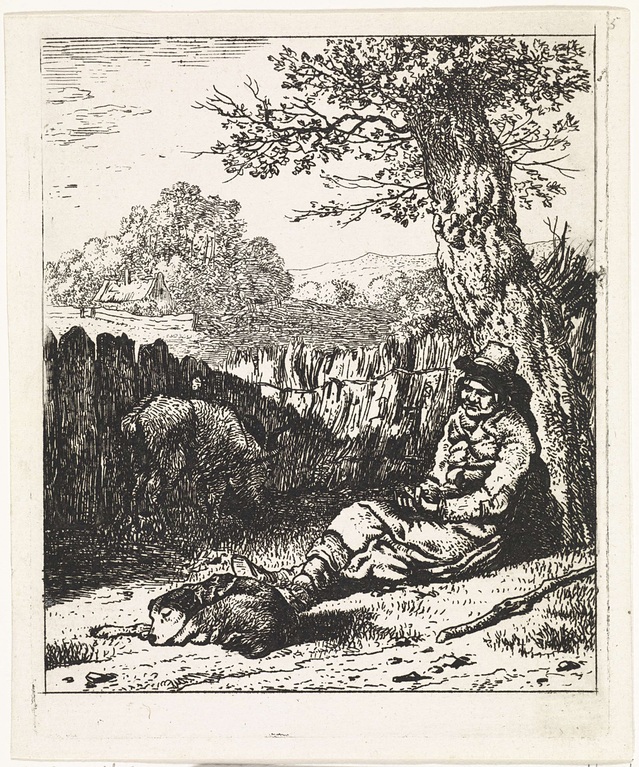 Zittende man aan de voet van een boom. Aan zijn voeten ligt een hond te slapen.