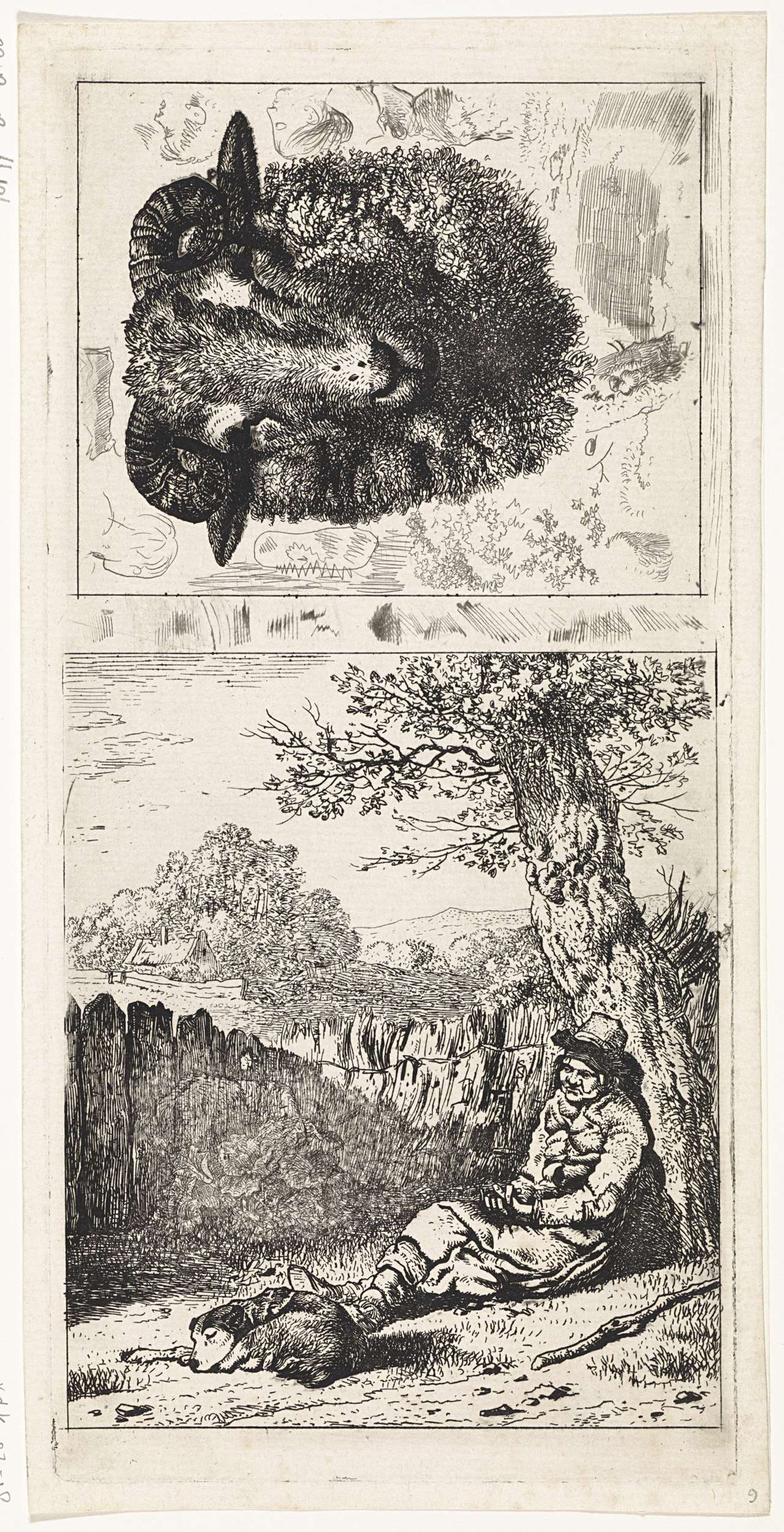 Links een ramskop en etsoefeningen. Rechts een zittende man aan de voet van een boom. Aan zijn voeten ligt een hond te slapen.