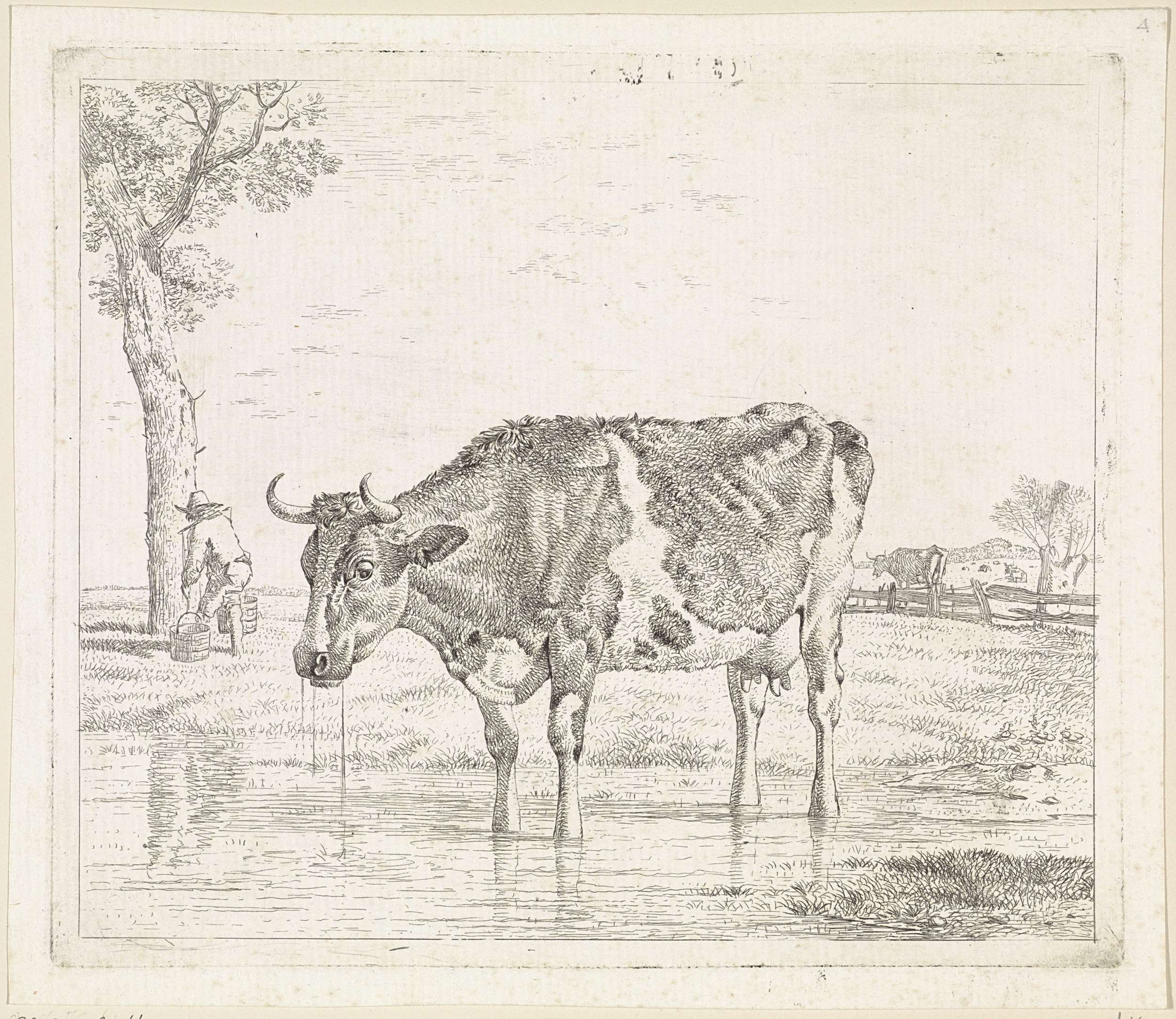Een drinkende koe in een drassige wei. Op de achtergrond bij de boom een man met melkemmers aan een juk.