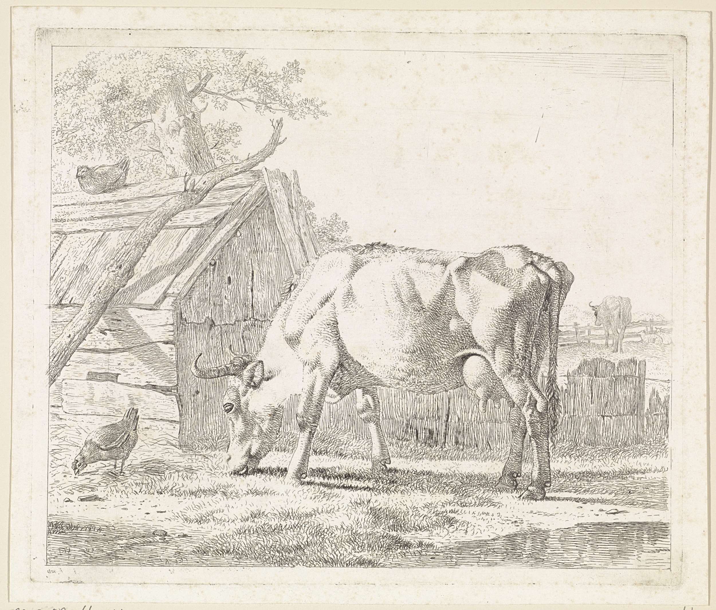 Grazende koe en een kip