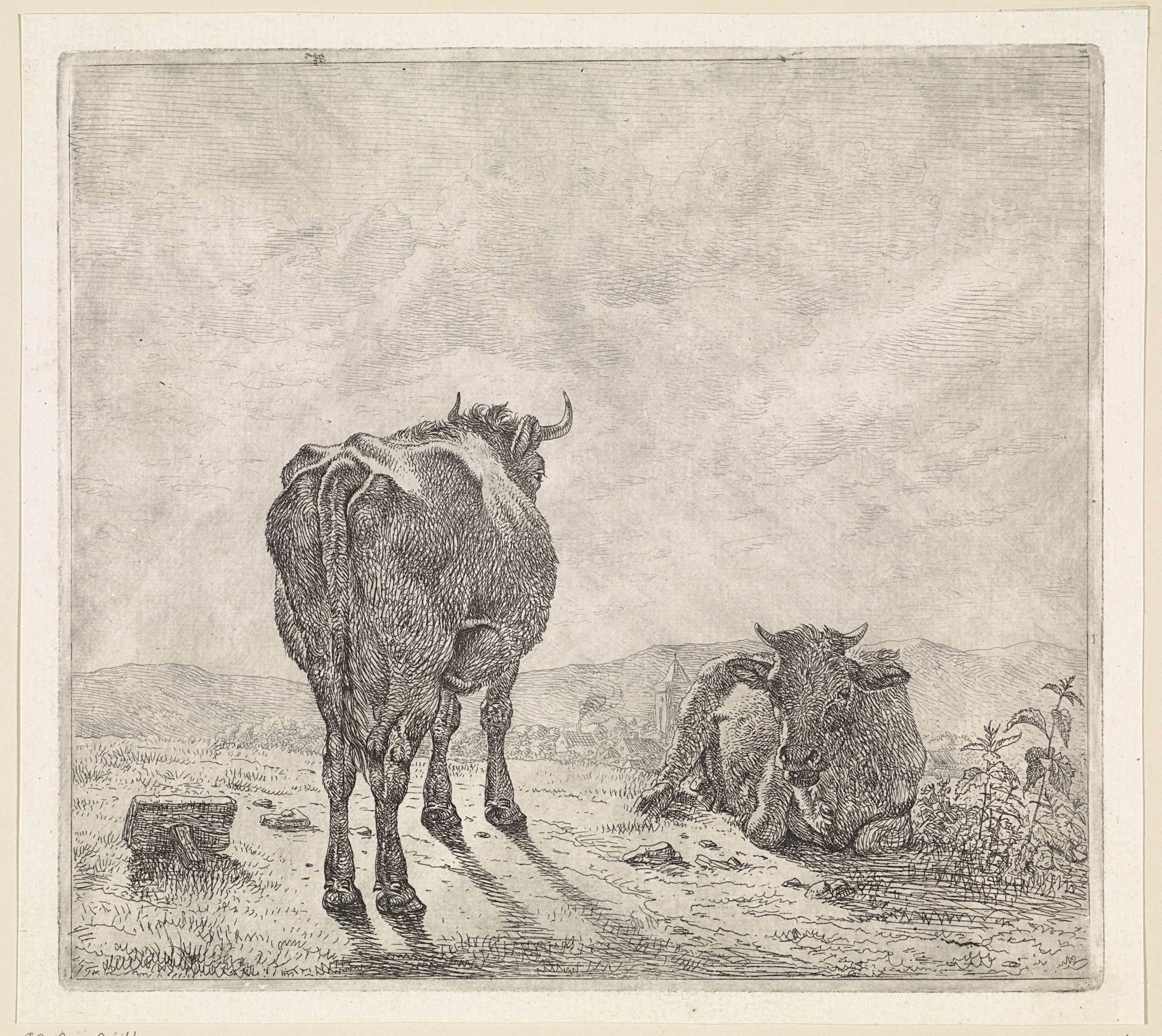 Twee koeien en op de achtergrond een dorp