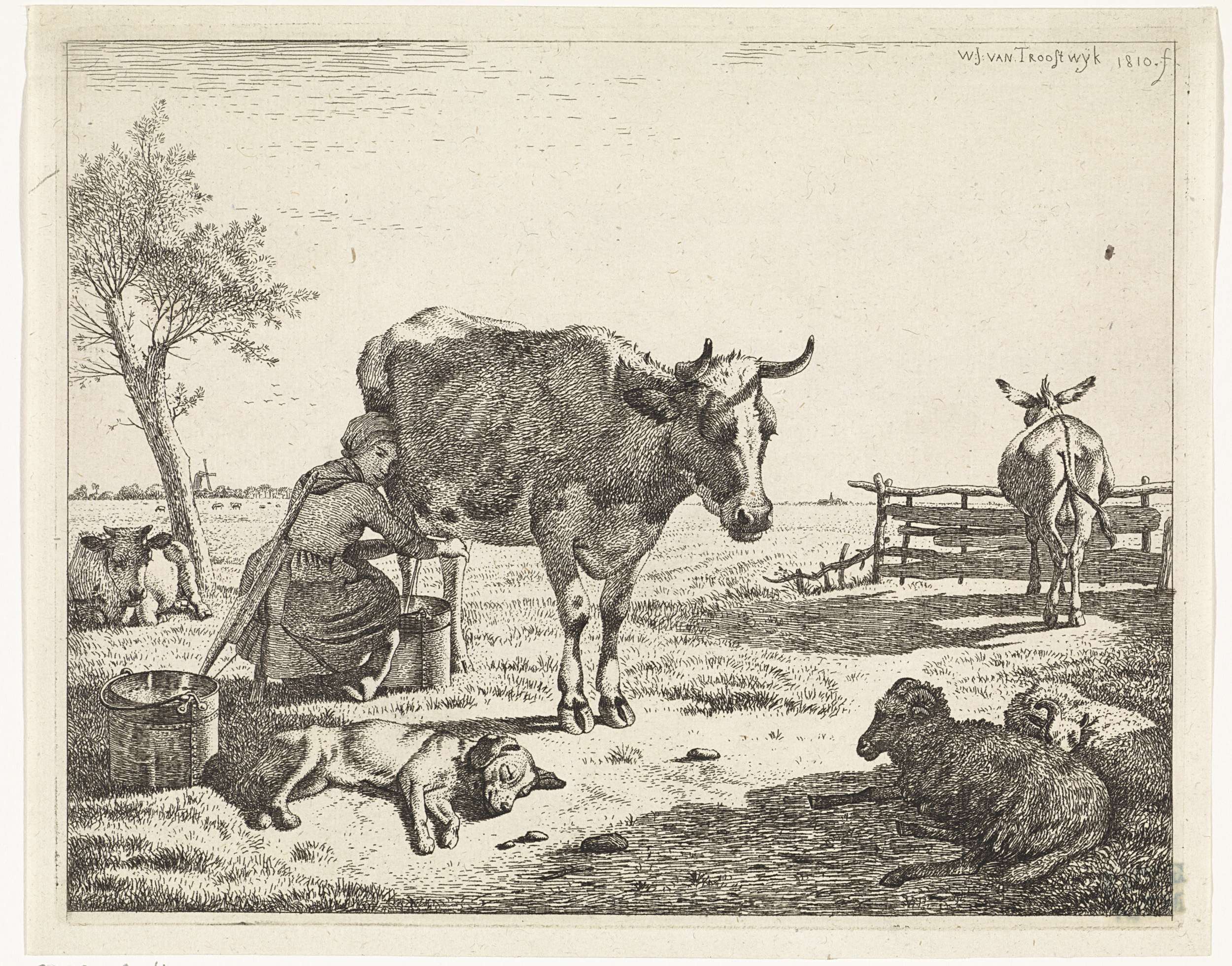 In een weiland melkt een vrouw een koe. Op de voorgrond ligt een hond te slapen. Rechts een liggend schaap.
