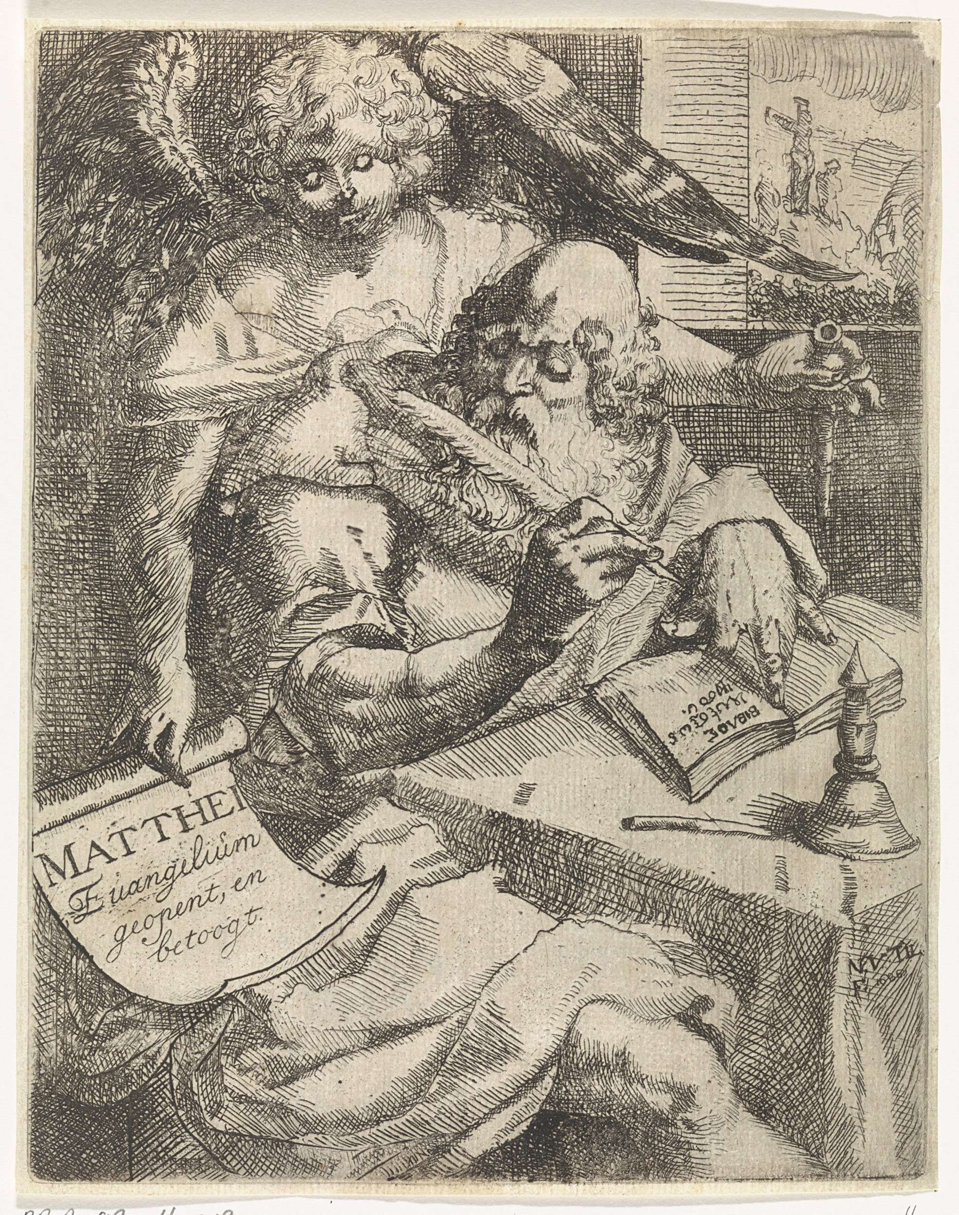 De evangelist Matteüs schrijft zijn evangelie aan een tafel. De engel geeft aanwijzingen. Door het venster is de kruisiging van Christus te zien.