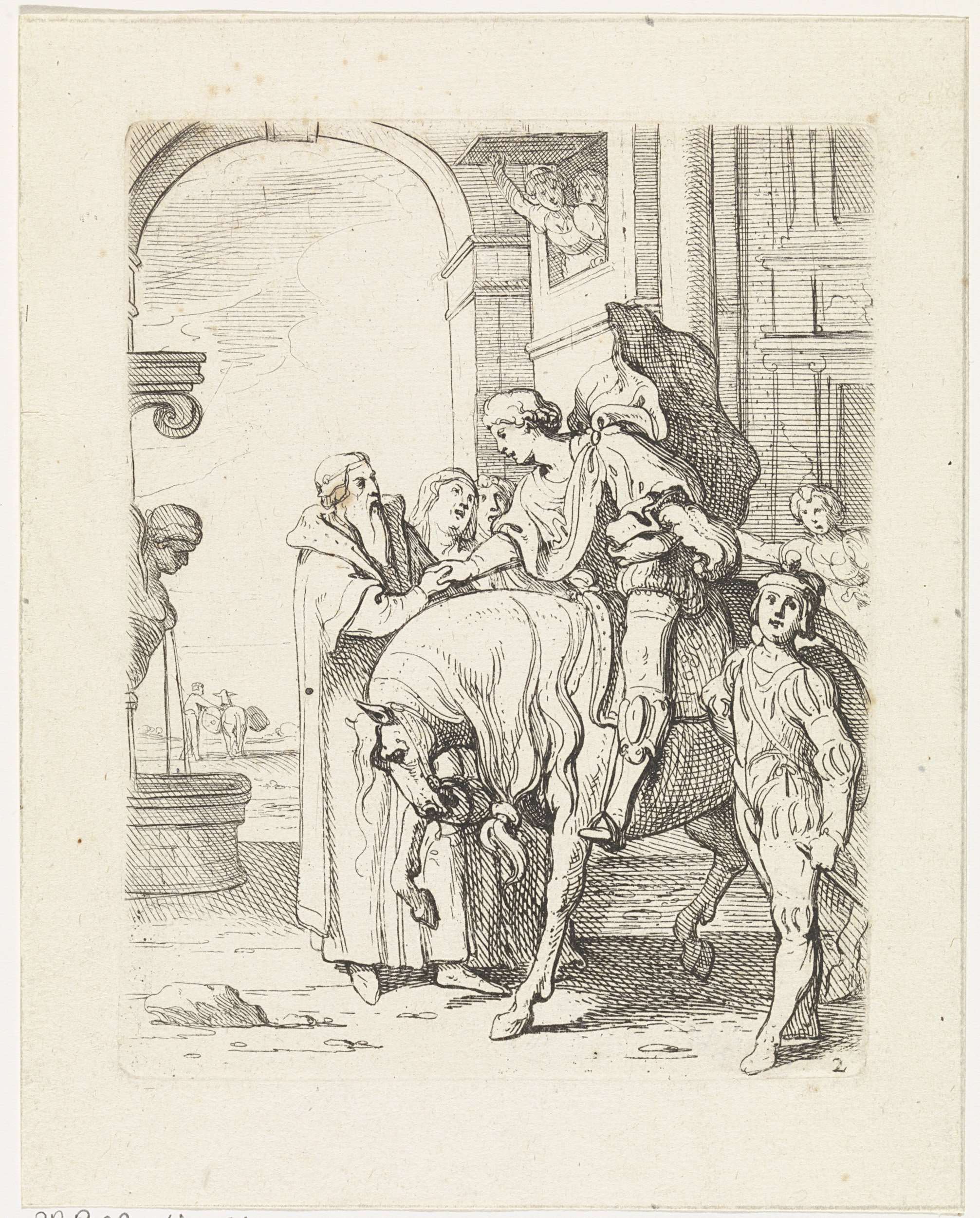 De verloren zoon neemt afscheid van zijn vader. Hij schudt hem de hand vanaf zijn paard. Op de achtergrond een poort.
