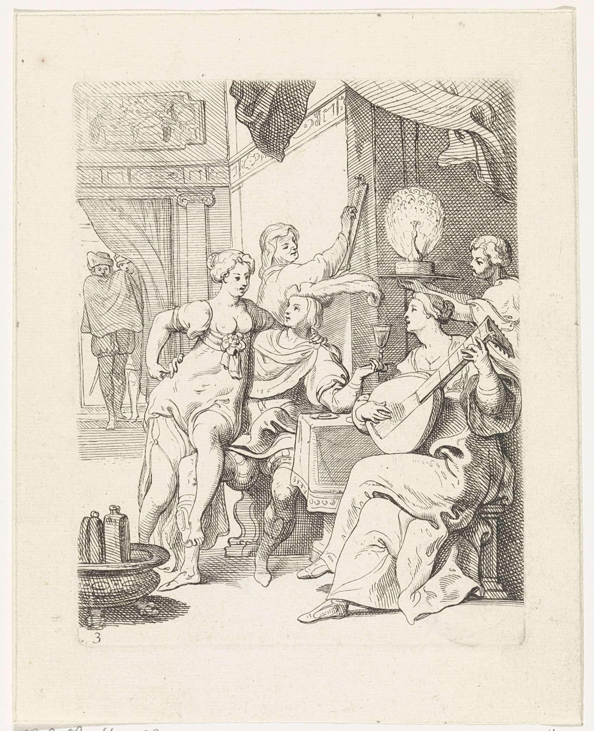 De verloren zoon verkwist zijn geld door een losbandig leven te leiden. Hij slaat zijn arm om de middel van een prostituee en houdt een glas wijn in de andere hand. Een vrouw bespeelt de luit en een man brengt een pastei binnen.