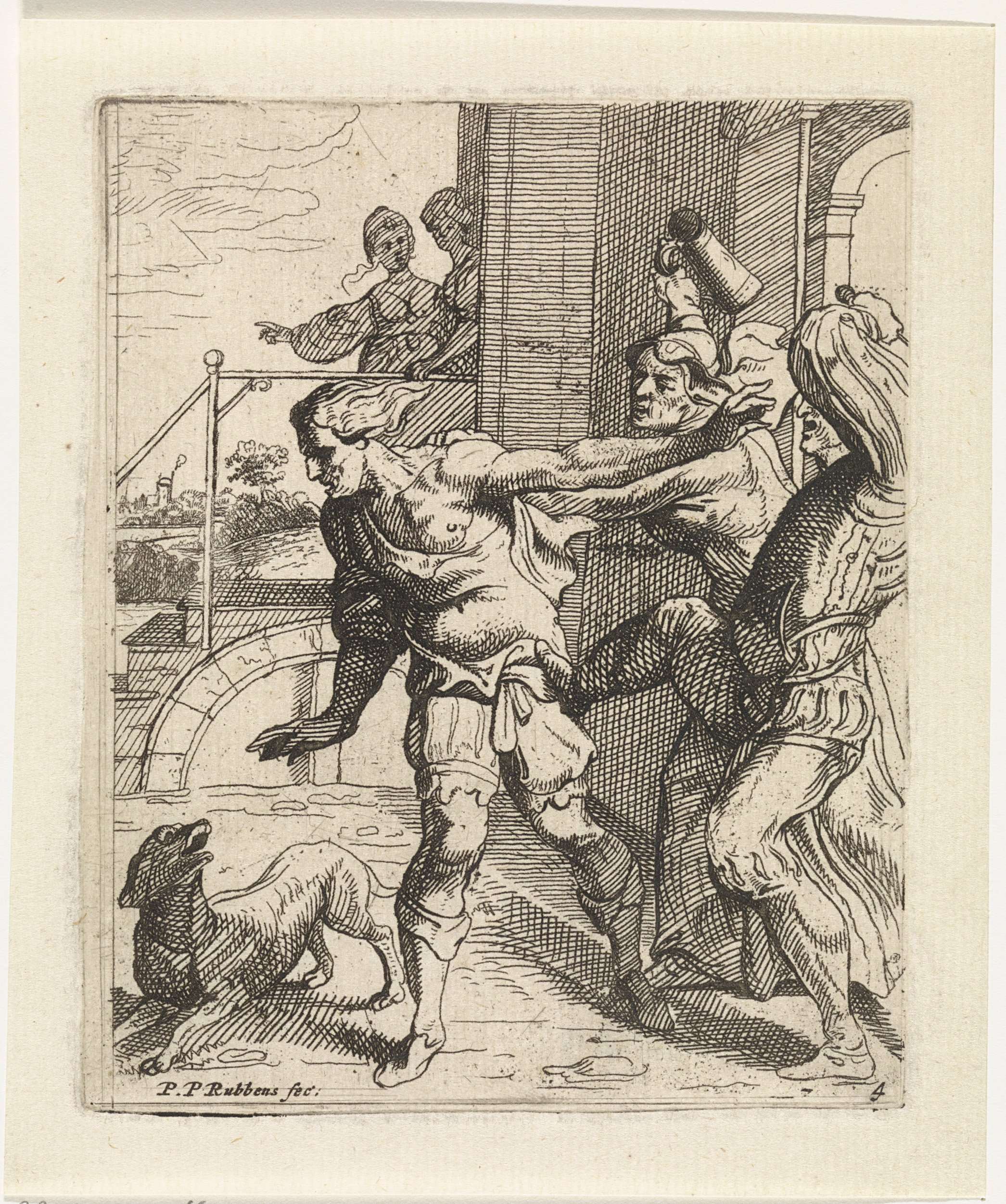 De verloren zoon wordt door twee mannen de herberg en het bordeel uitgezet, omdat zijn geld op is. Naast hem een hond.