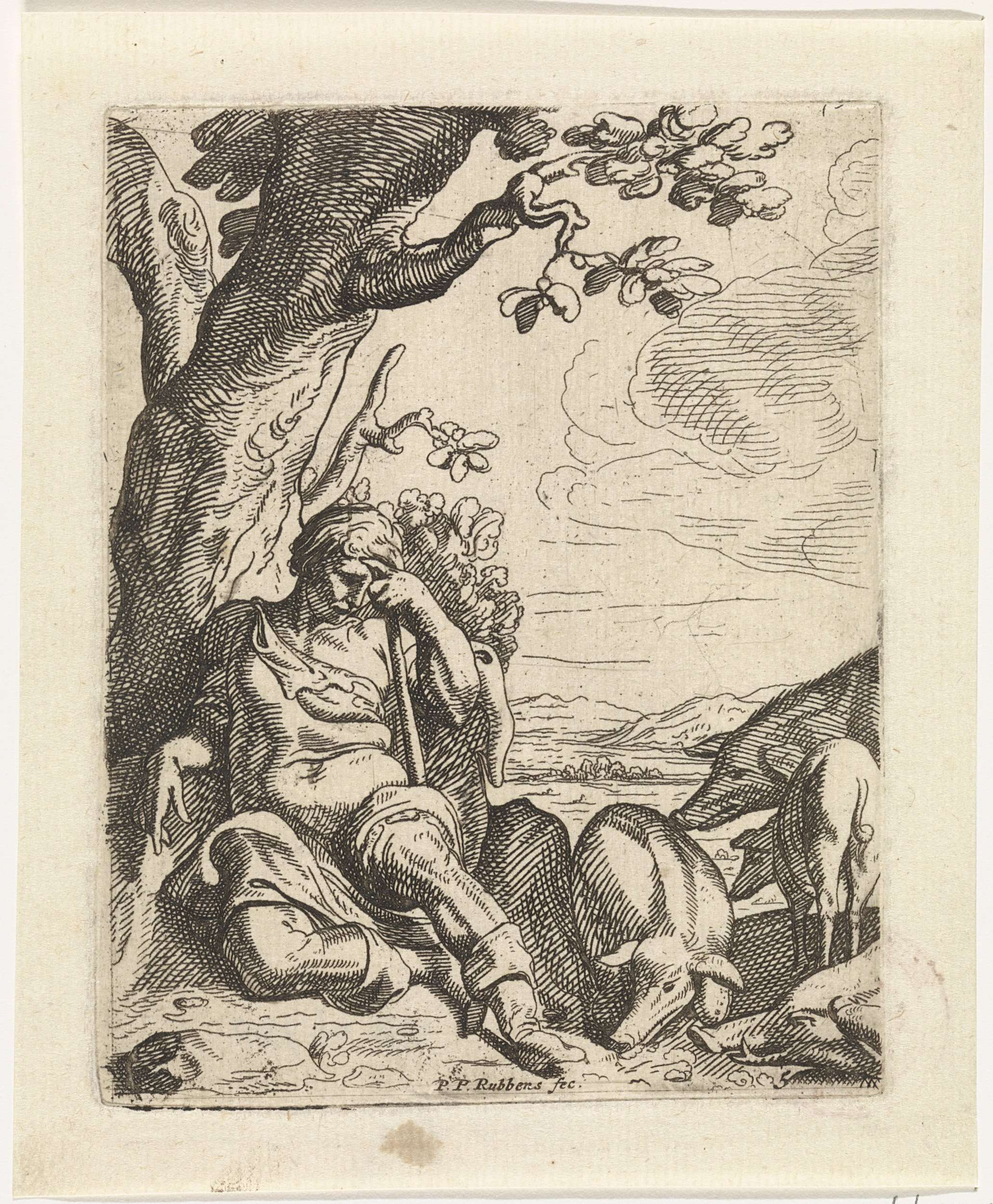 De verloren zoon als varkenshoeder zittend onder een boom.