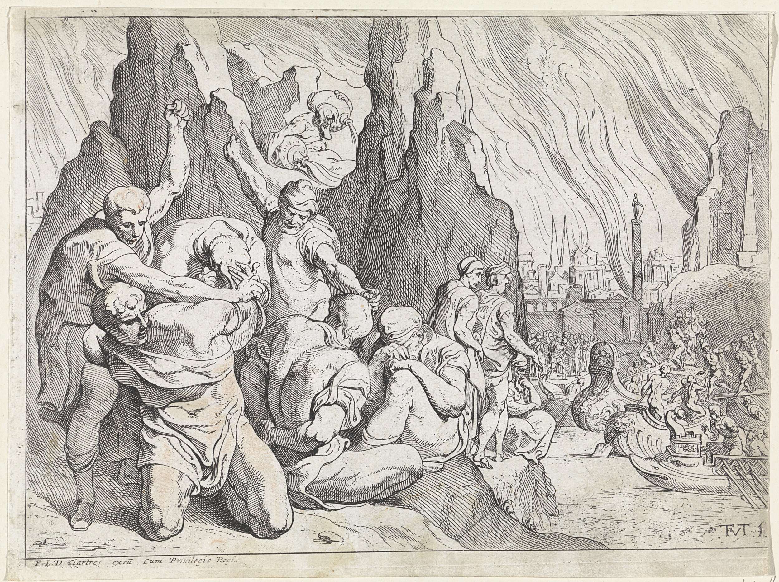 De Grieken gaan aan boord en nemen krijgsgevangen Trojanen mee. Op de achtergrond de brandende stad Troje. Op de voorgrond slaan enkele Grieken Trojanen, die de klappen proberen te ontwijken.