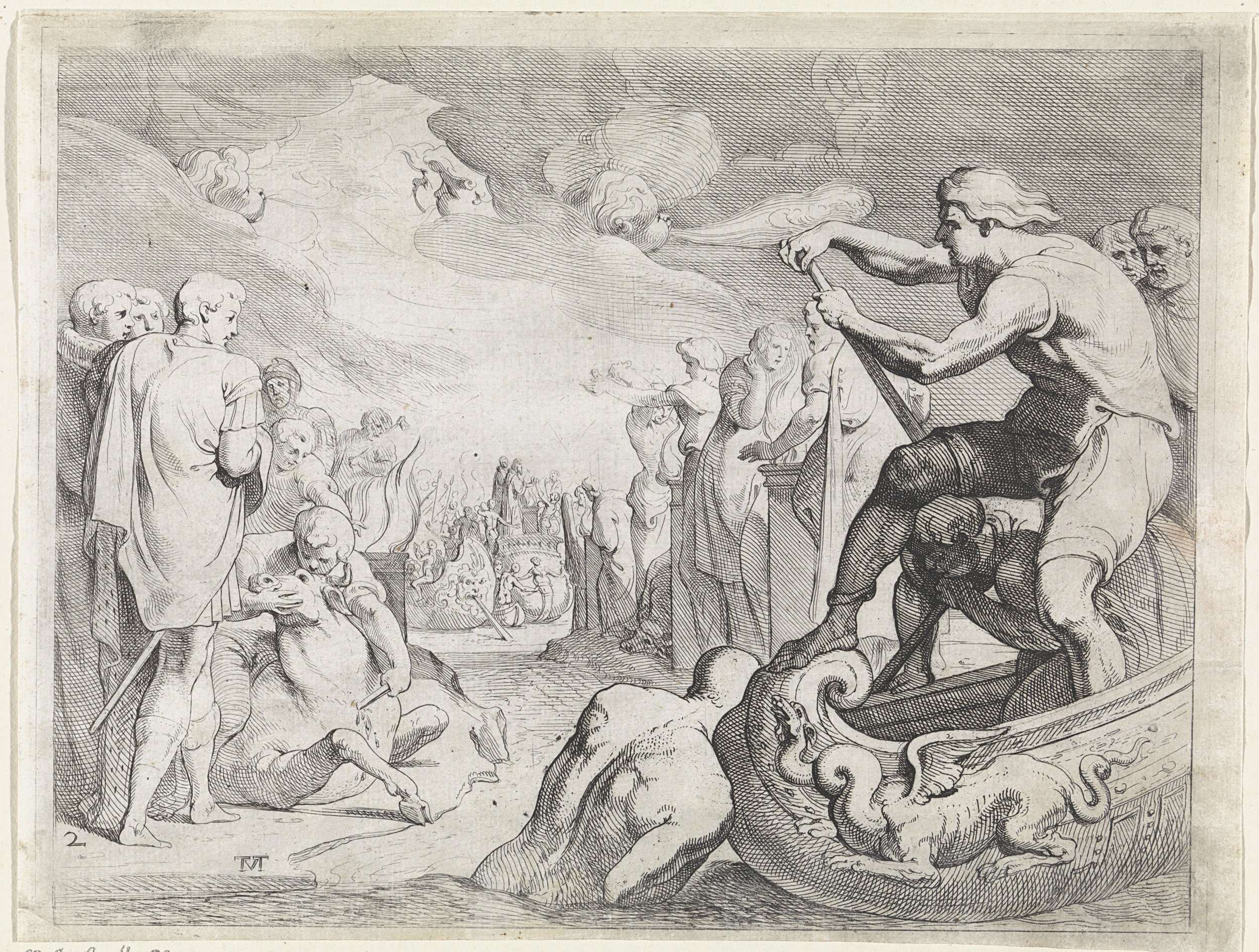 Odysseus en andere Grieken offeren aan de goden als dank voor de val van Troje. Schepen liggen klaar voor vertrek.