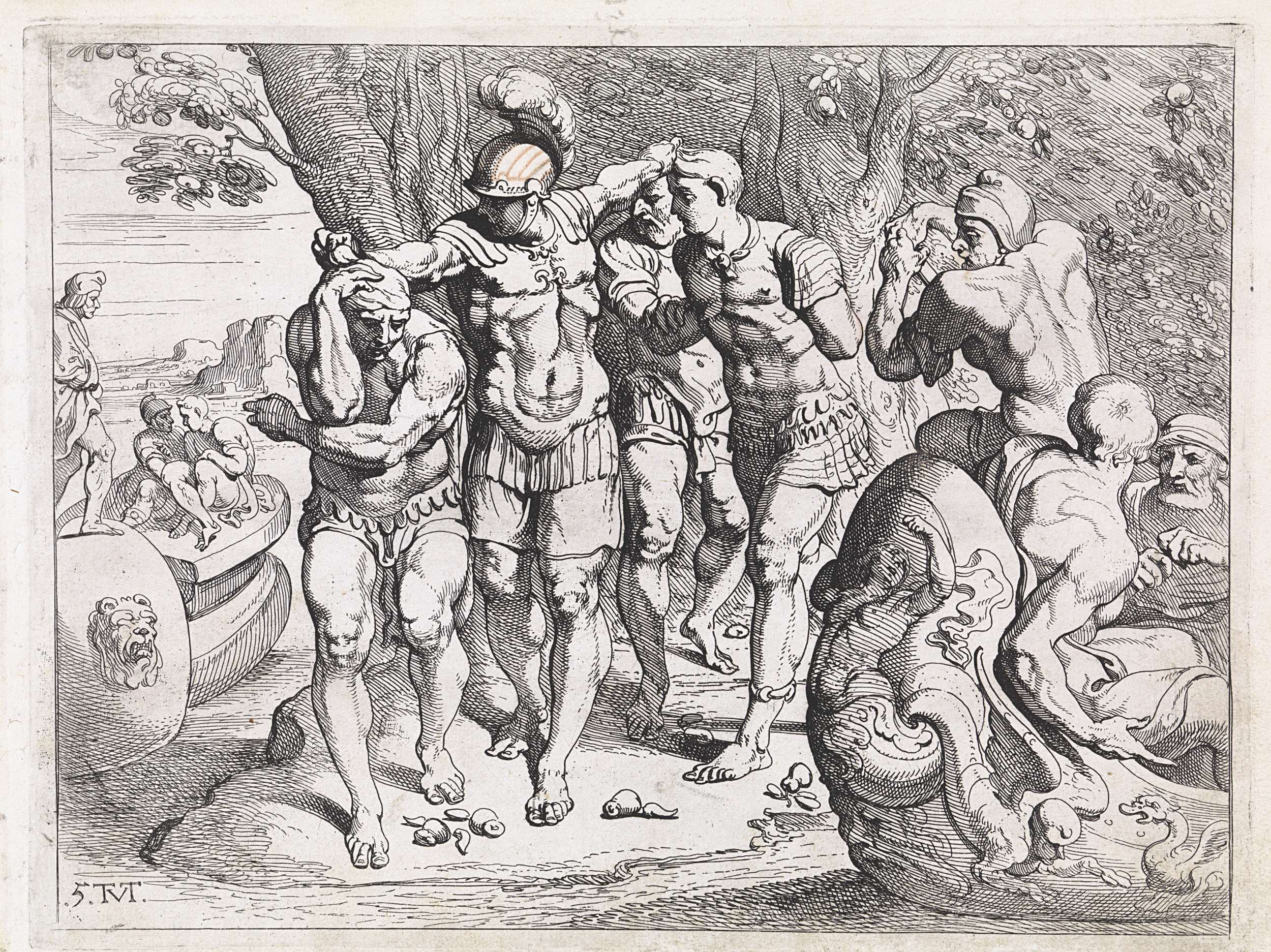 Op het eiland van de lotuseters grijpt Odysseus zijn drie verkenners bij de haren en neemt ze mee naar de schepen. Nadat de verkenners van de lotusbloemen op het eiland hadden gegeten wilden ze niet meer vertrekken.