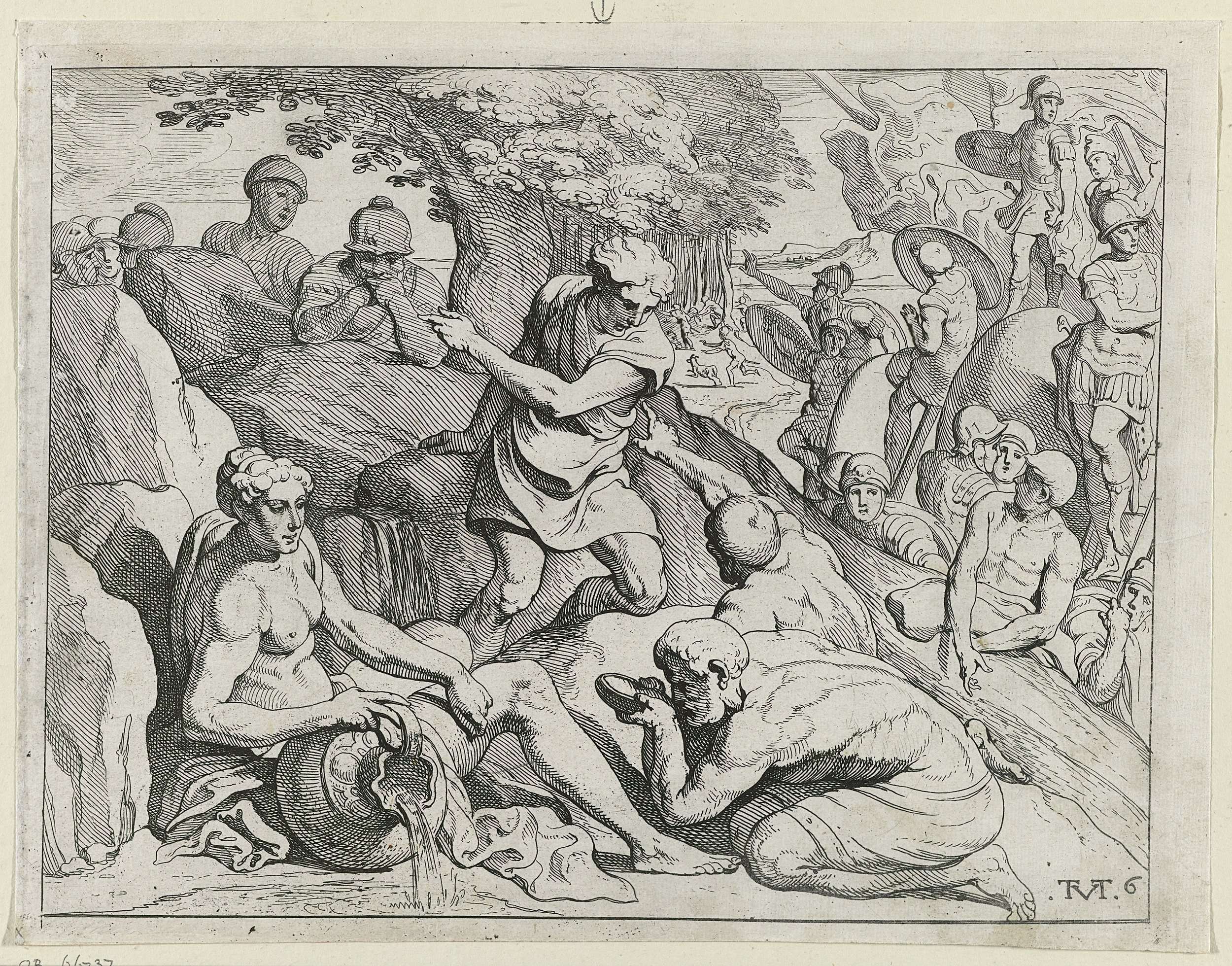 Odysseus arriveert met zijn mannen op het eiland van de Cyclopen. Op de voorgrond drinkt een van zijn mannen uit een zak wijn van de Kikonen.
