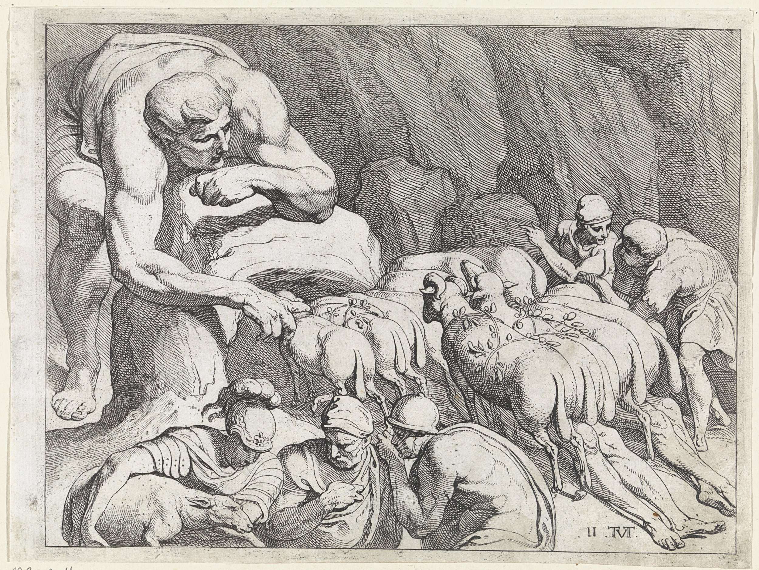 De door Odysseus blind gemaakte reus Polyphemus opent zijn grot om zijn kudde schapen naar buiten te laten. Odysseus en zijn mannen ontsnappen aan de reus door onder de rammen en schapen te gaan hangen.