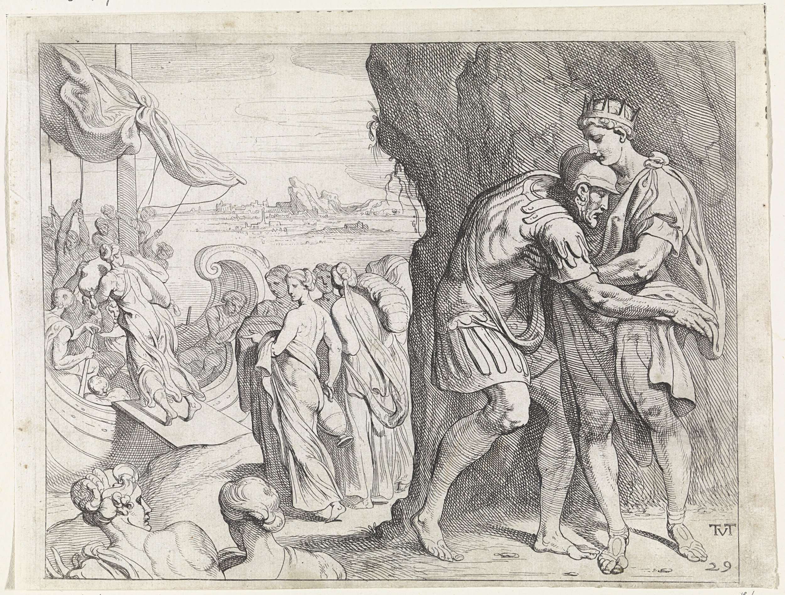 Odysseus neemt afscheid van koning Alcinoüs. Op de achtergrond maken de Faiaken een schip klaar om Odysseus naar Ithaca te varen.
