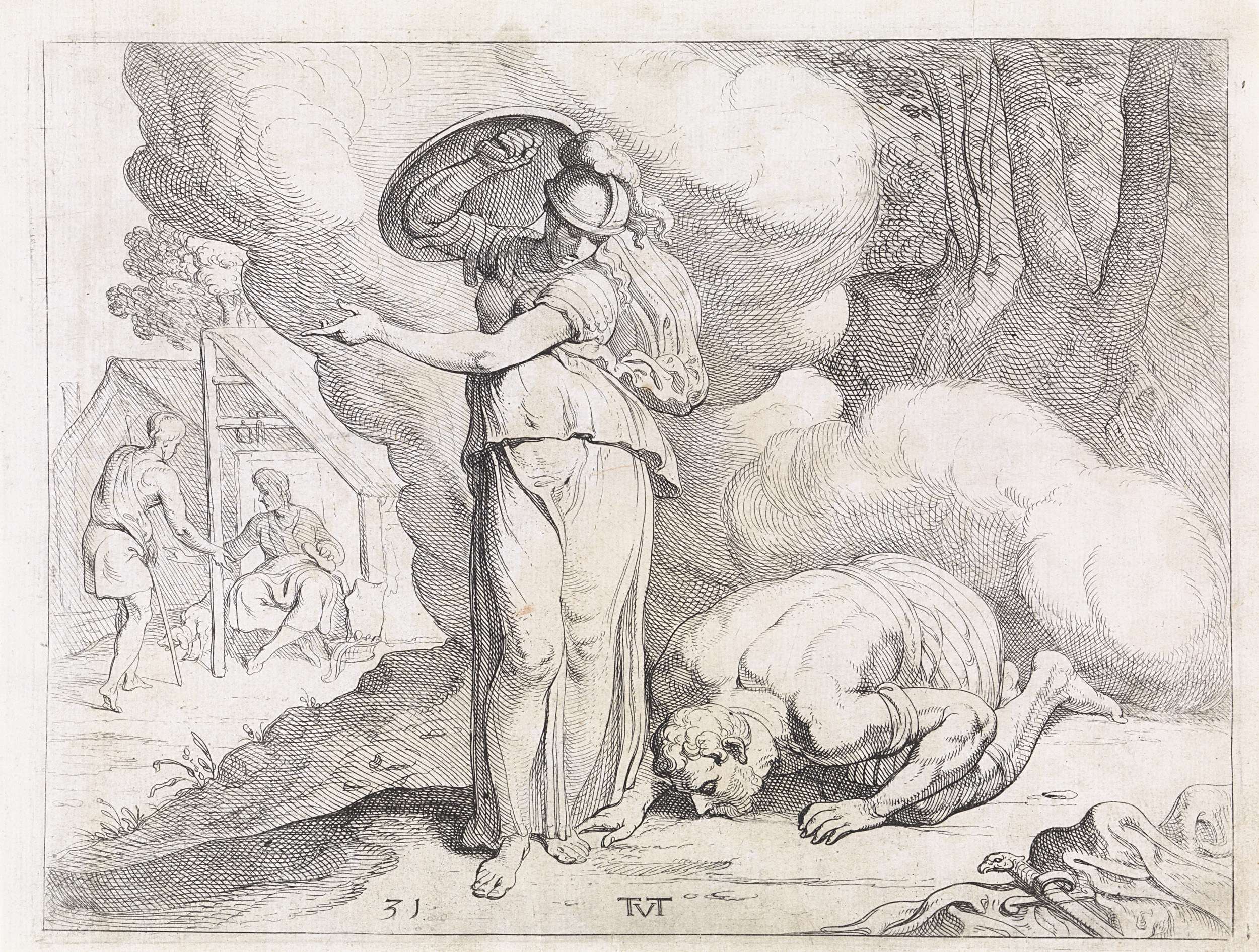 Als Odysseus ontwaakt op een voor hem vreemd en in mist gehuld eiland ontmoet hij Minerva. Als zij de mist laat optrekken, herkent Odysseus zijn thuisland. Hij kust de grond. Minerva geeft hem de gedaante van een zwerver, zodat hij niet herkend zal worden. Links op de achtergrond bezoekt de verklede Odysseus de zwijnenhoeder Eumaios.