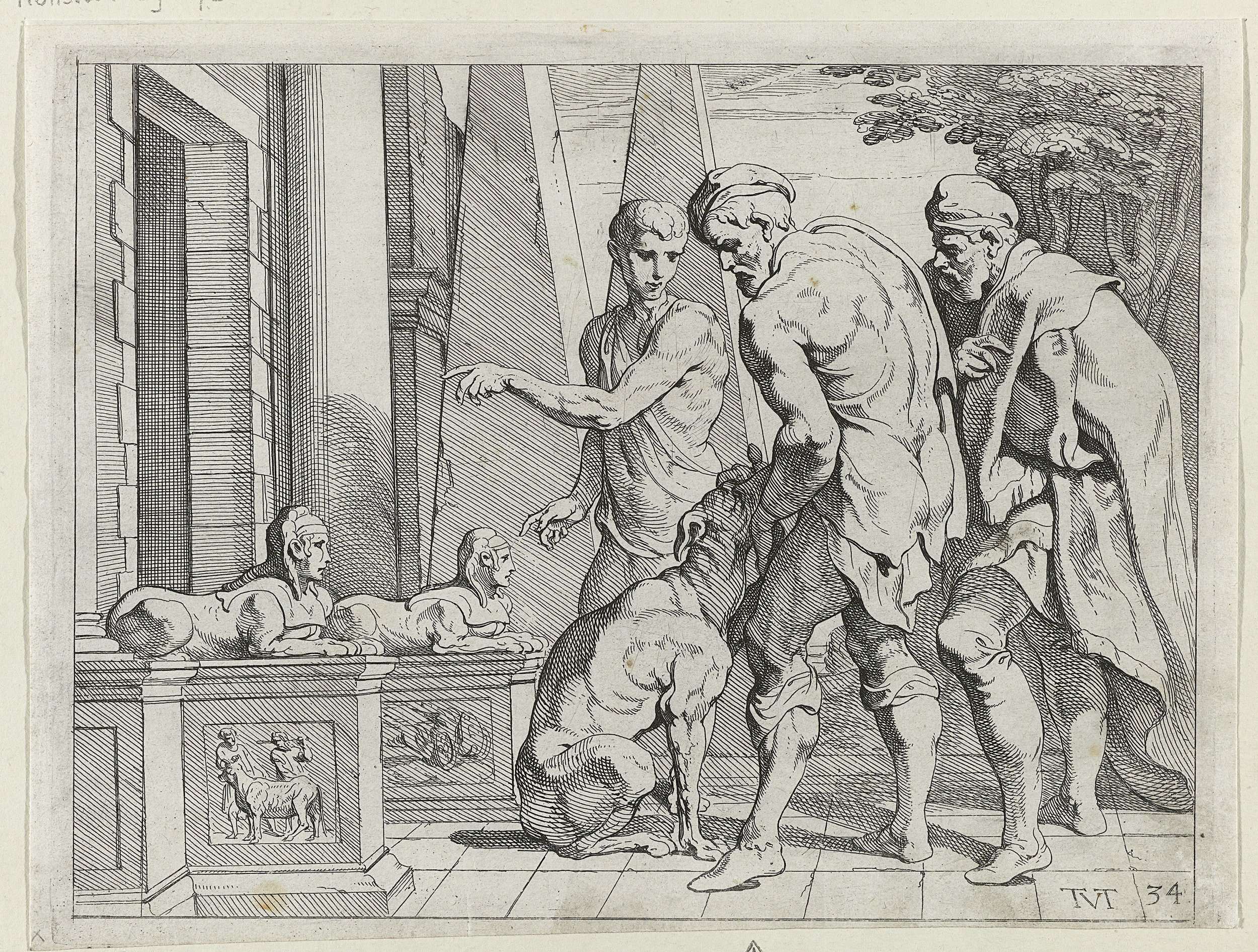 Odysseus, verkleed als zwerver, wordt door zijn hond Argus herkend. Hij wordt vergezeld door Telemachus en Eumaios.