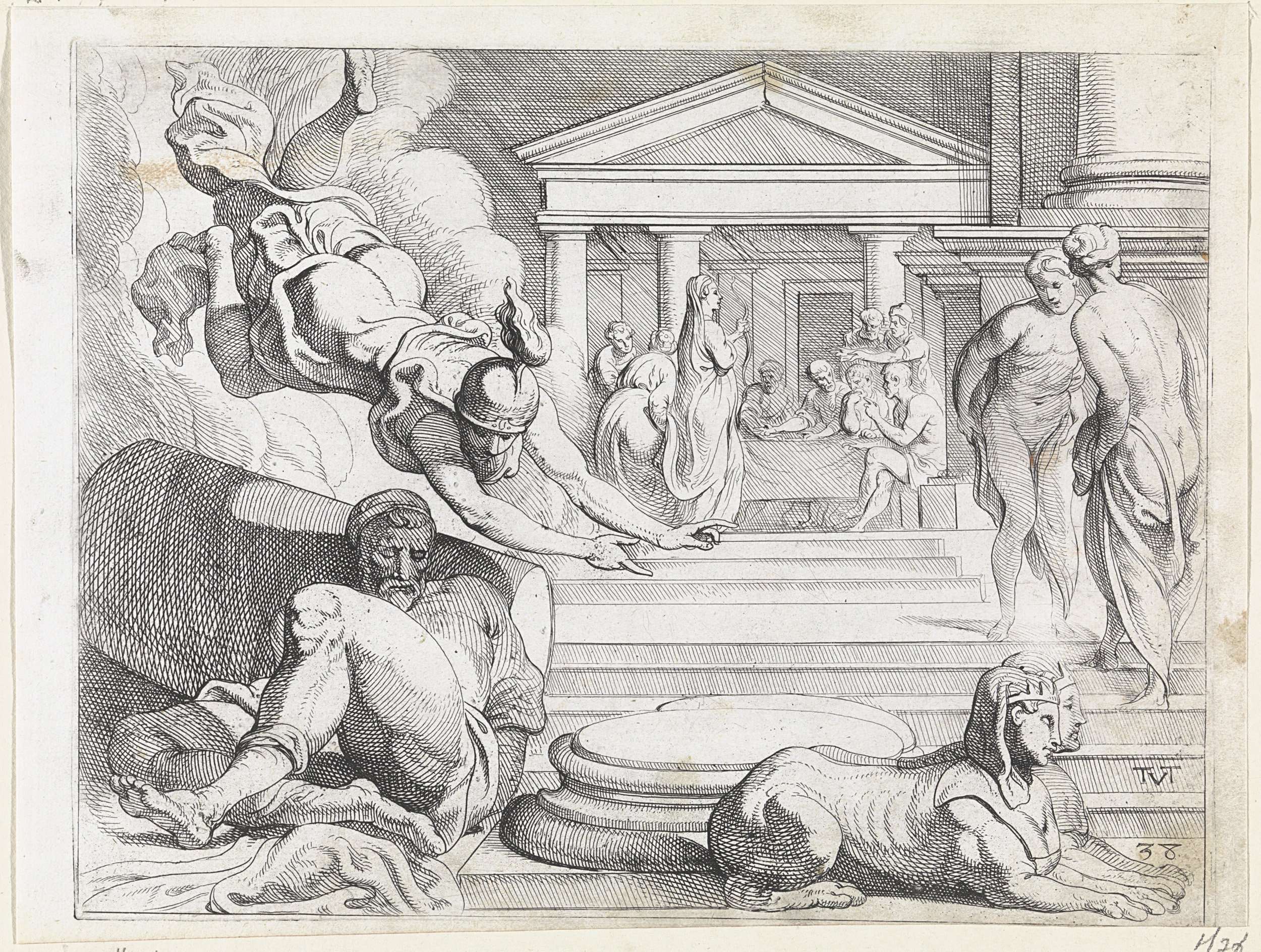 Minerva bezoekt de slapende Odysseus en zet hem ertoe aan naar het paleis te gaan en de boog te spannen. Op de achtergrond toont Penelope de boog van Odysseus aan haar vrijers en deelt daarbij mee dat ze zal trouwen met degene die de boog kan spannen.