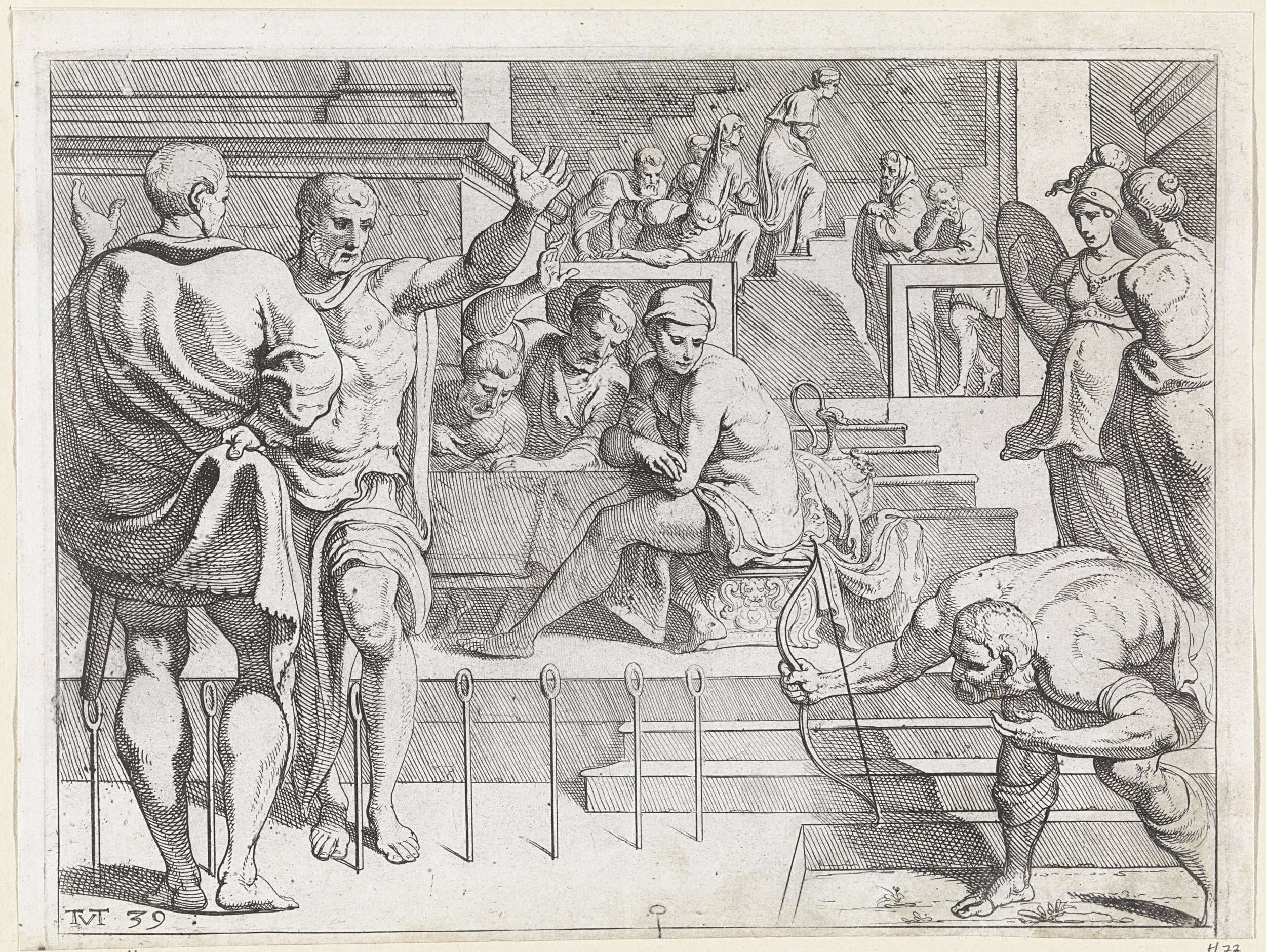 In de aanwezigheid van Penelope's vrijers spant Odysseus de boog en schiet een pijl door twaalf ringen.