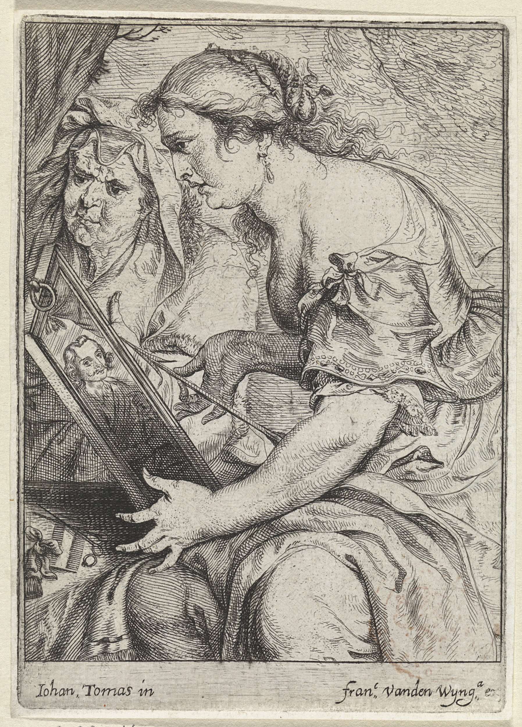 Een vrouw houdt het portret van een man in haar ene hand en een pijl in haar andere hand. Achter haar een vrouw. Op tafel een ring en een schaar.