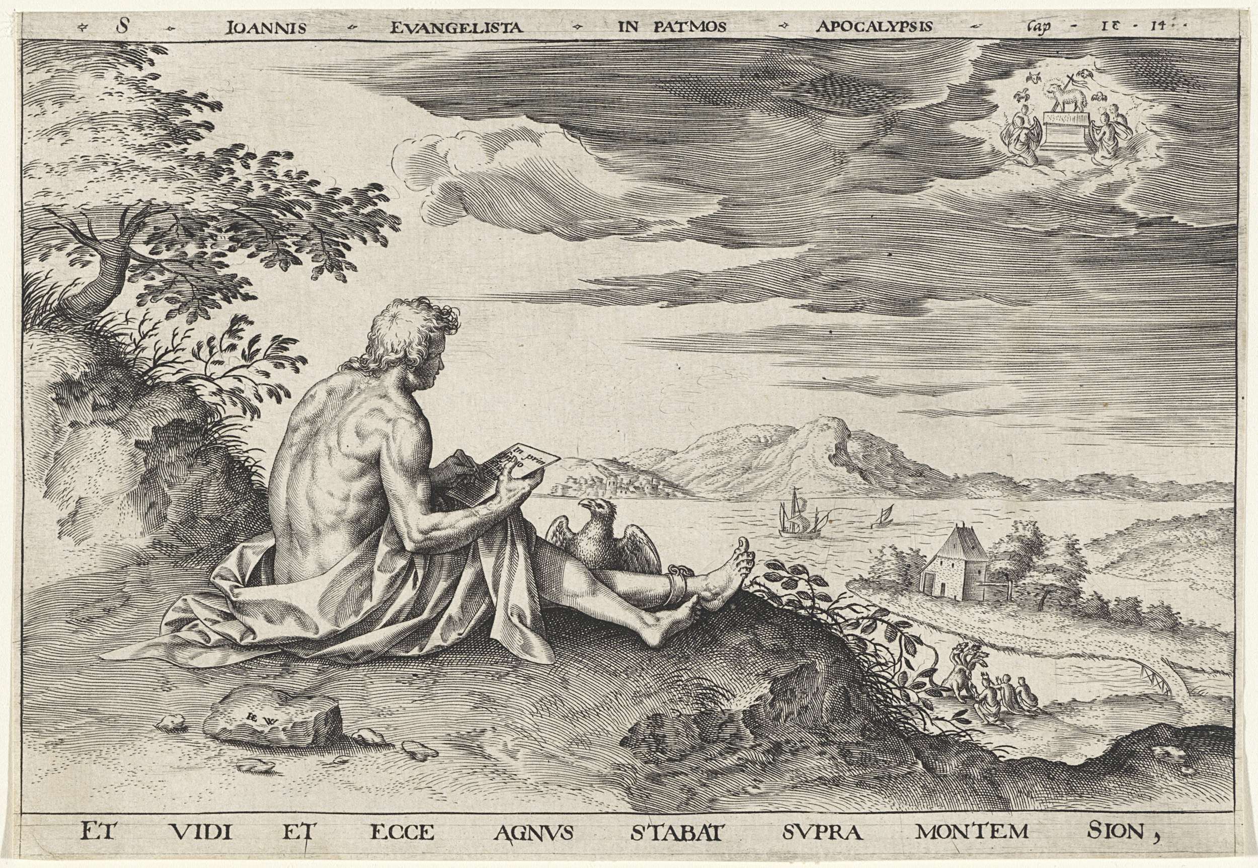Johannes de Evangelist zit op een heuvel en schrijft zijn evangelie. De adelaar zit aan zijn voeten. In het landschap op de achtergrond de aanbidding van het beest met tien horens en zeven koppen. In de lucht het Lam, te midden van de vier apocalyptische dieren. In de marge een onderschrift in het Latijn.