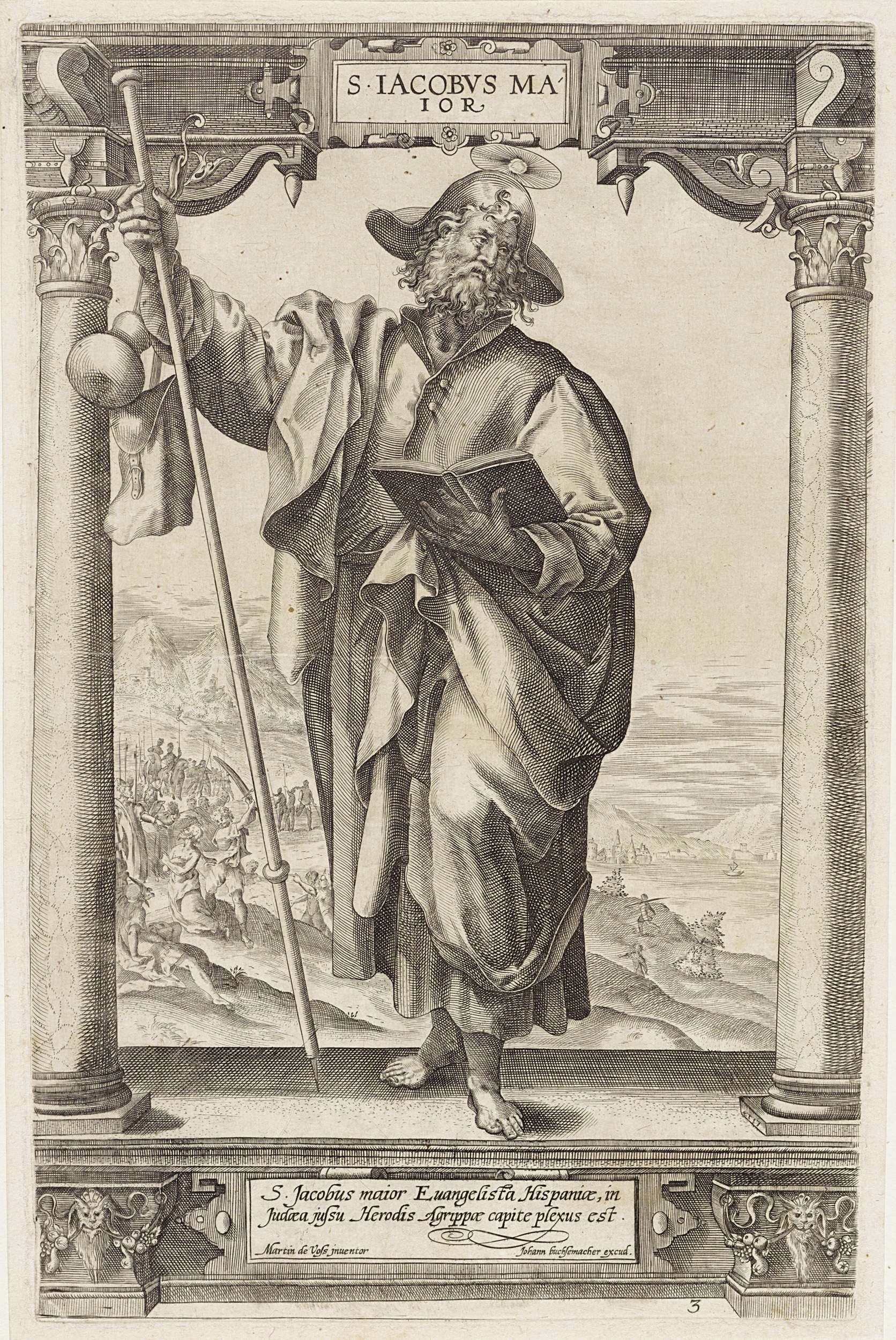 De heilige Jakobus de Meerdere staat tussen twee zuilen in een architecturale omlijsting. In zijn ene hand houdt hij een opengeslagen boek, in de andere zijn pelgrimsstaf. Op de achtergrond wordt hij door soldaten onthoofd. In het kader onderaan een tweeregelig onderschrift in het Latijn.