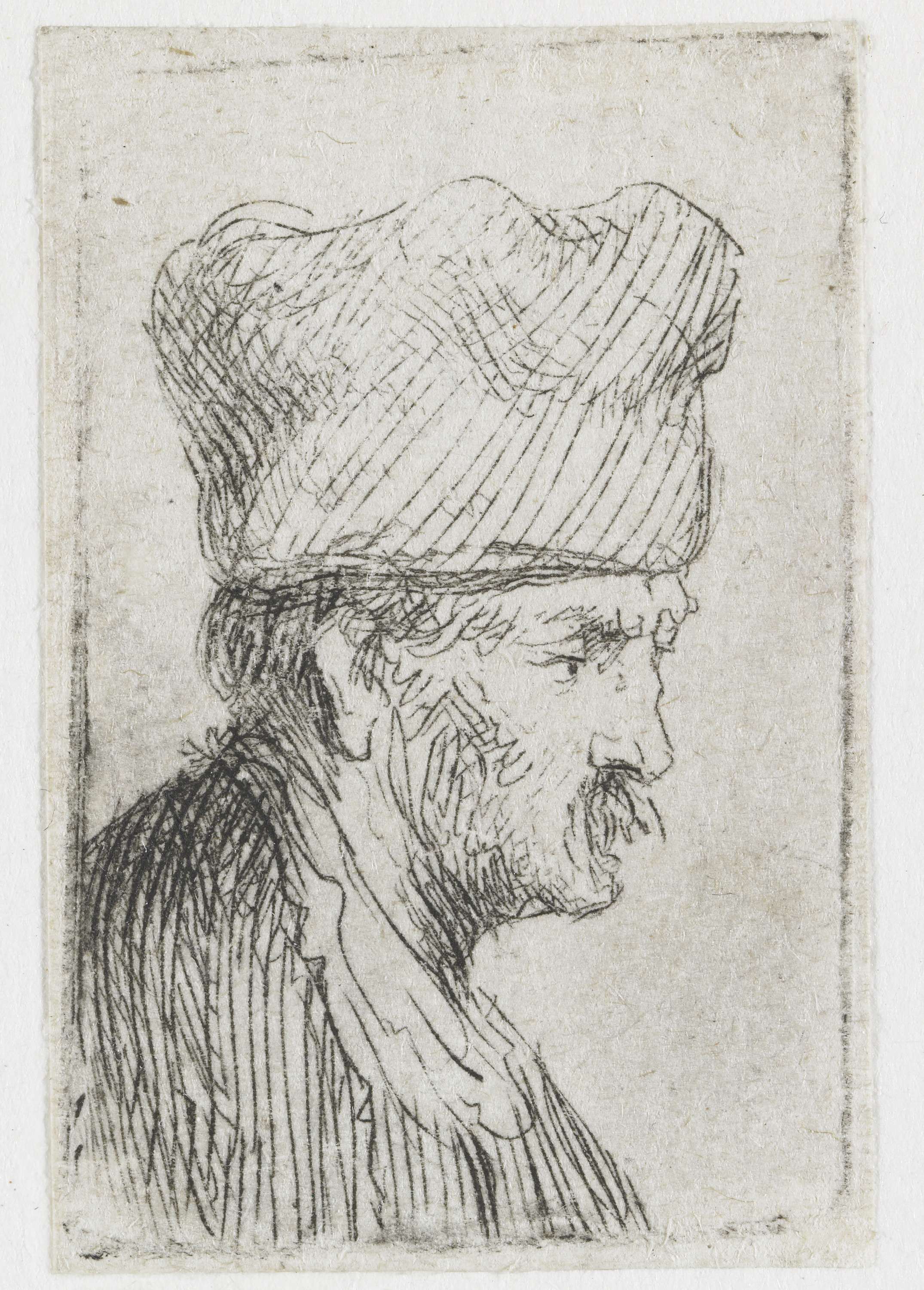 Opnieuw vijf kleine manskopjes, maar nu is zeker dat ze niet als losse prentjes zijn ontstaan. Oorspronkelijk stonden ze allemaal op een en dezelfde koperplaat. Nadat Rembrandt die plaat had verknipt, voltooide hij de etsjes afzonderlijk. Deze werkwijze was ongewoon en ook dat karakteriseert Rembrandt, die als kunstenaar wel vaker de ongebaande paden koos.