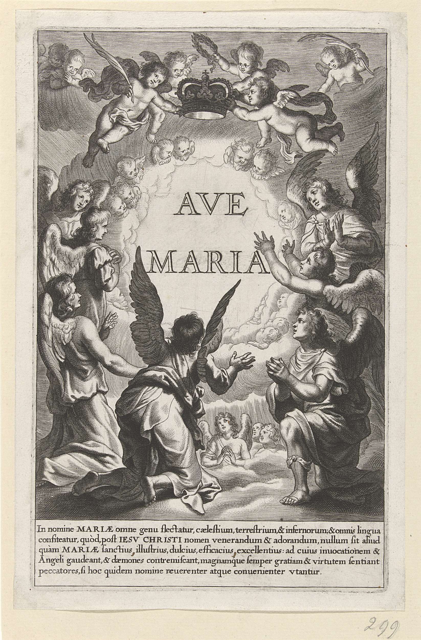 Titelprent voor een serie die waarschijnlijk bestaat uit vier prenten met verschillende voorstellingen van de staande Maria omgeven door engelen. Een groep engelen heeft zich verzameld om Maria te kronen. De engelen houden een kroon, een palmtak en een lauwerkrans vast. Onder de voorstelling een Latijnse tekst over Maria.