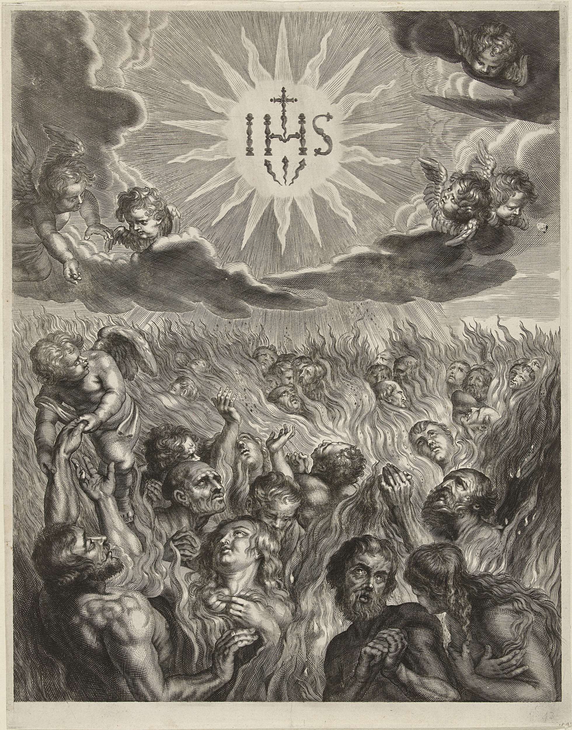 Een grote groep mensen gaat op in de vlammenzee van het vagevuur. Een engel redt een van hen en trekt hem aan zijn arm uit het vuur omhoog naar de hemel. In de hemel kijken cherubijnen en engelen naar het vuur beneden. In het midden het Christusmonogram IHS in een stralende zon.