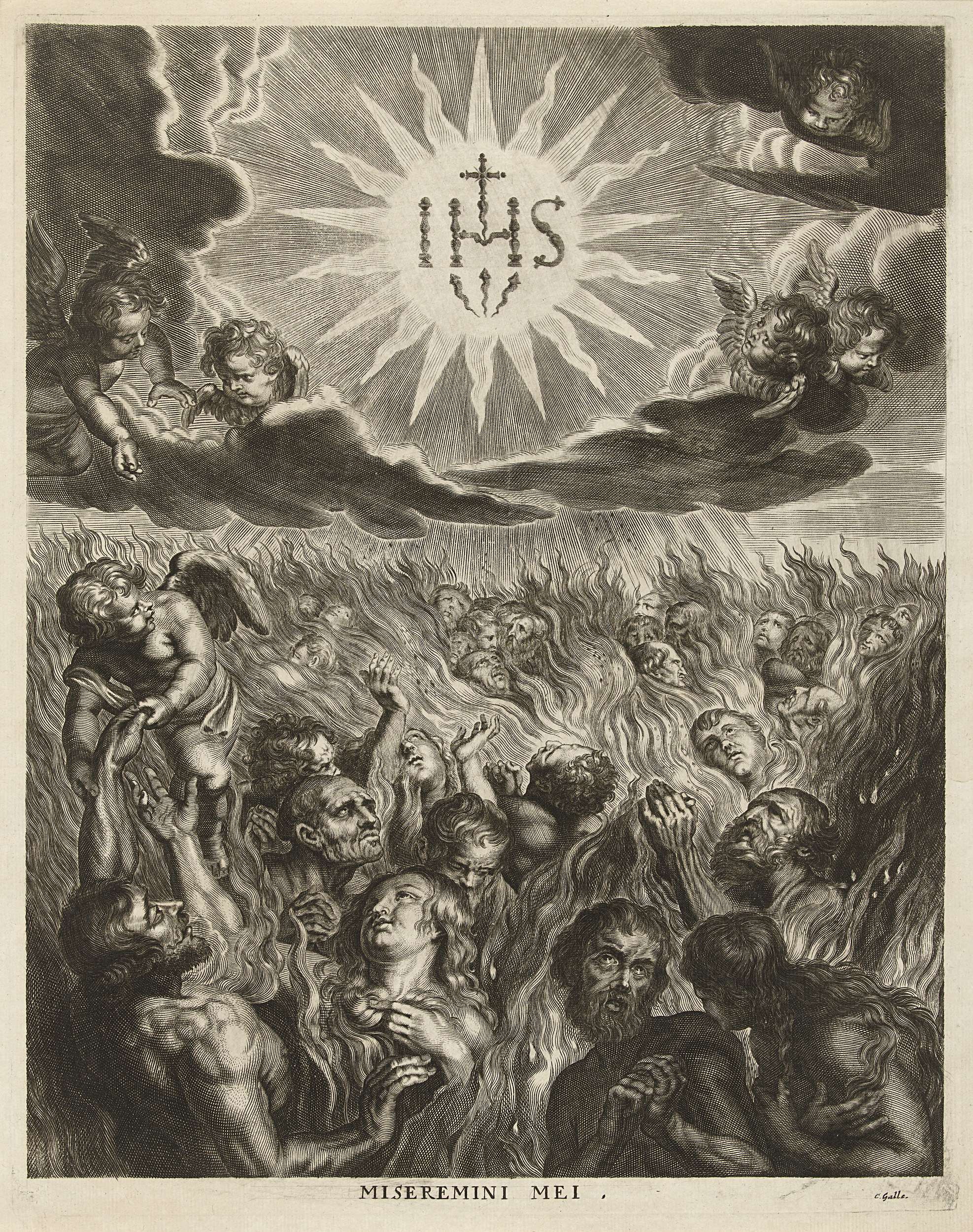 Een grote groep mensen gaat op in de vlammenzee van het vagevuur. Een engel redt een van hen en trekt hem aan zijn arm uit het vuur omhoog naar de hemel. In de hemel kijken cherubijnen en engelen naar het vuur beneden. In het midden het Christusmonogram IHS in een stralende zon.