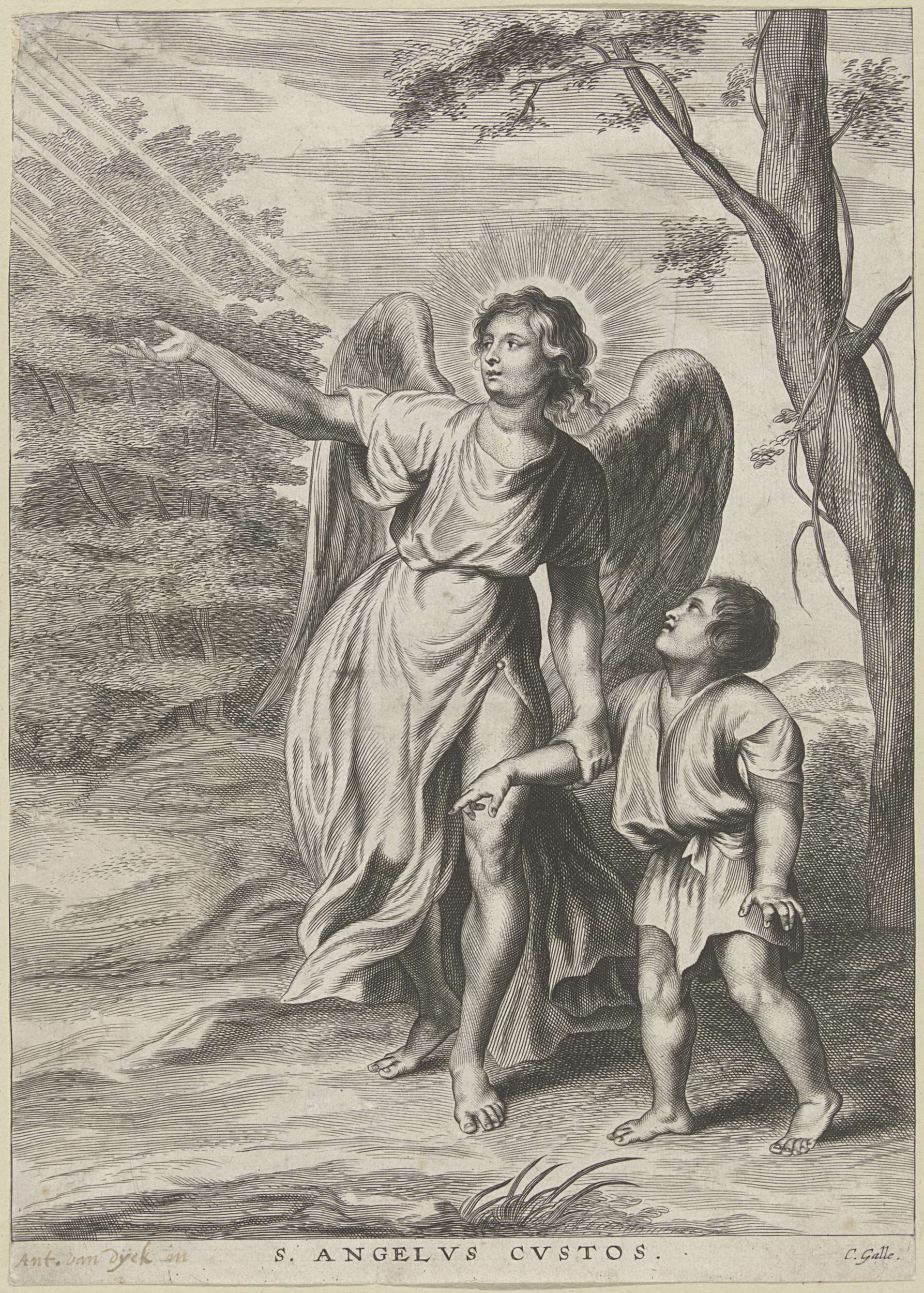 Een engel houdt een jongetje bij de arm vast en wijst hem de goede weg.