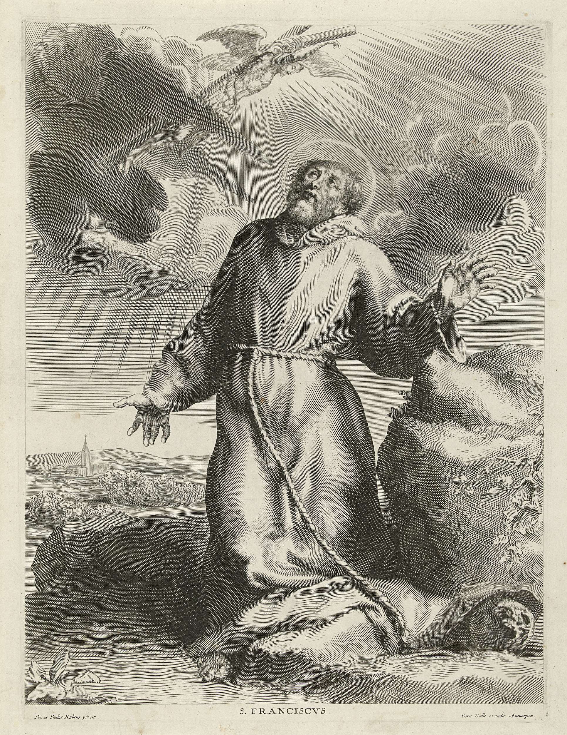 De heilige Franciscus heeft een visioen van een gevleugelde Christus aan het kruis, terwijl hij in de bergen voor een boek knielt. Hij draagt het habijt van de Franciscanen en de stigmata van Christus zijn duidelijk in zijn handpalmen te zien.