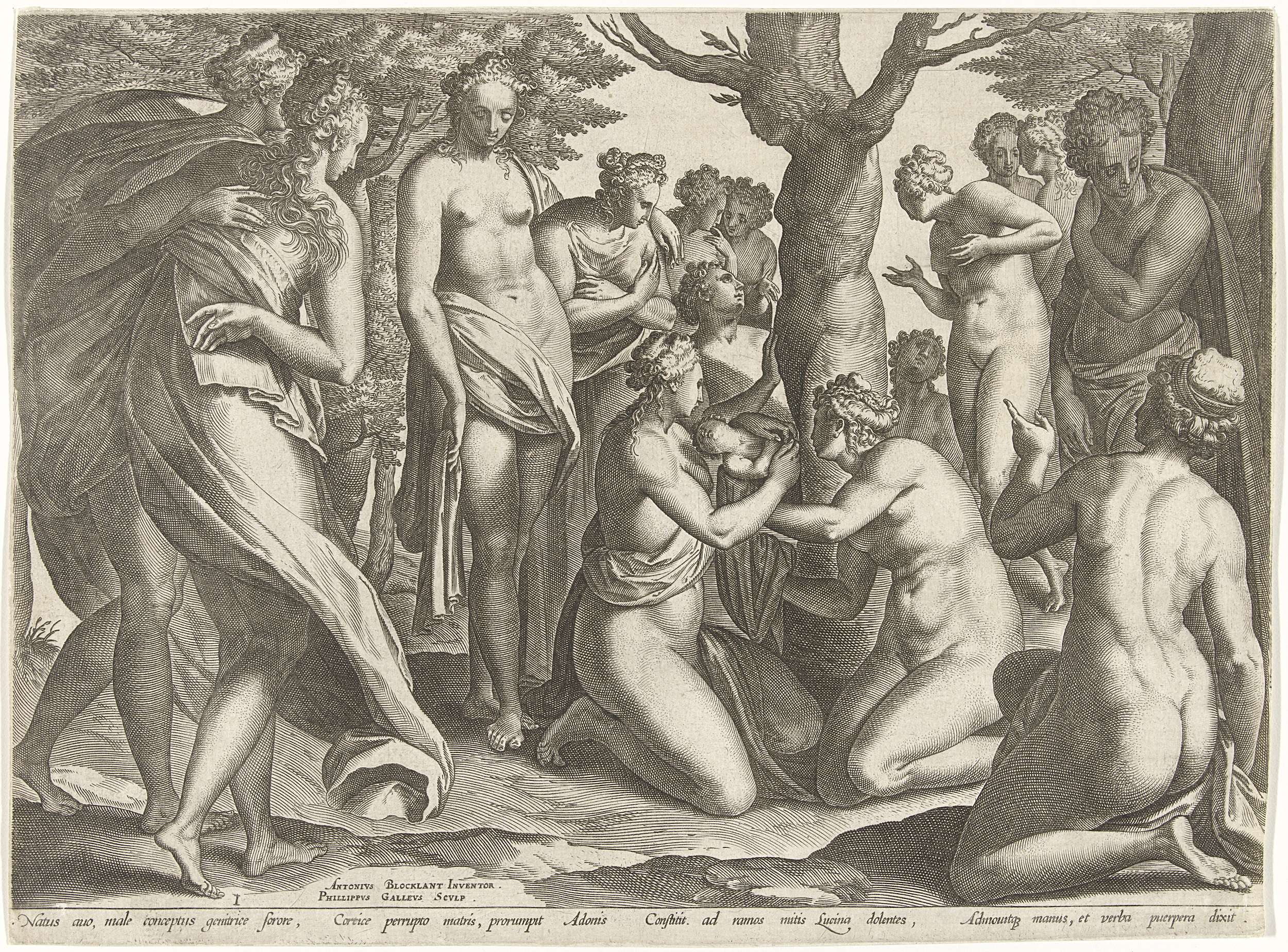 Adonis, de zoon van Myrrha en haar vader Cinyras, wordt geboren uit de stam van een boom. Zijn moeder werd tijdens haar zwangerschap namelijk op haar eigen verzoek in een mirreboom veranderd. De nimfen van het woud helpen bij de geboorte. De prent heeft een Latijns onderschrift en maakt deel uit van een serie over ...