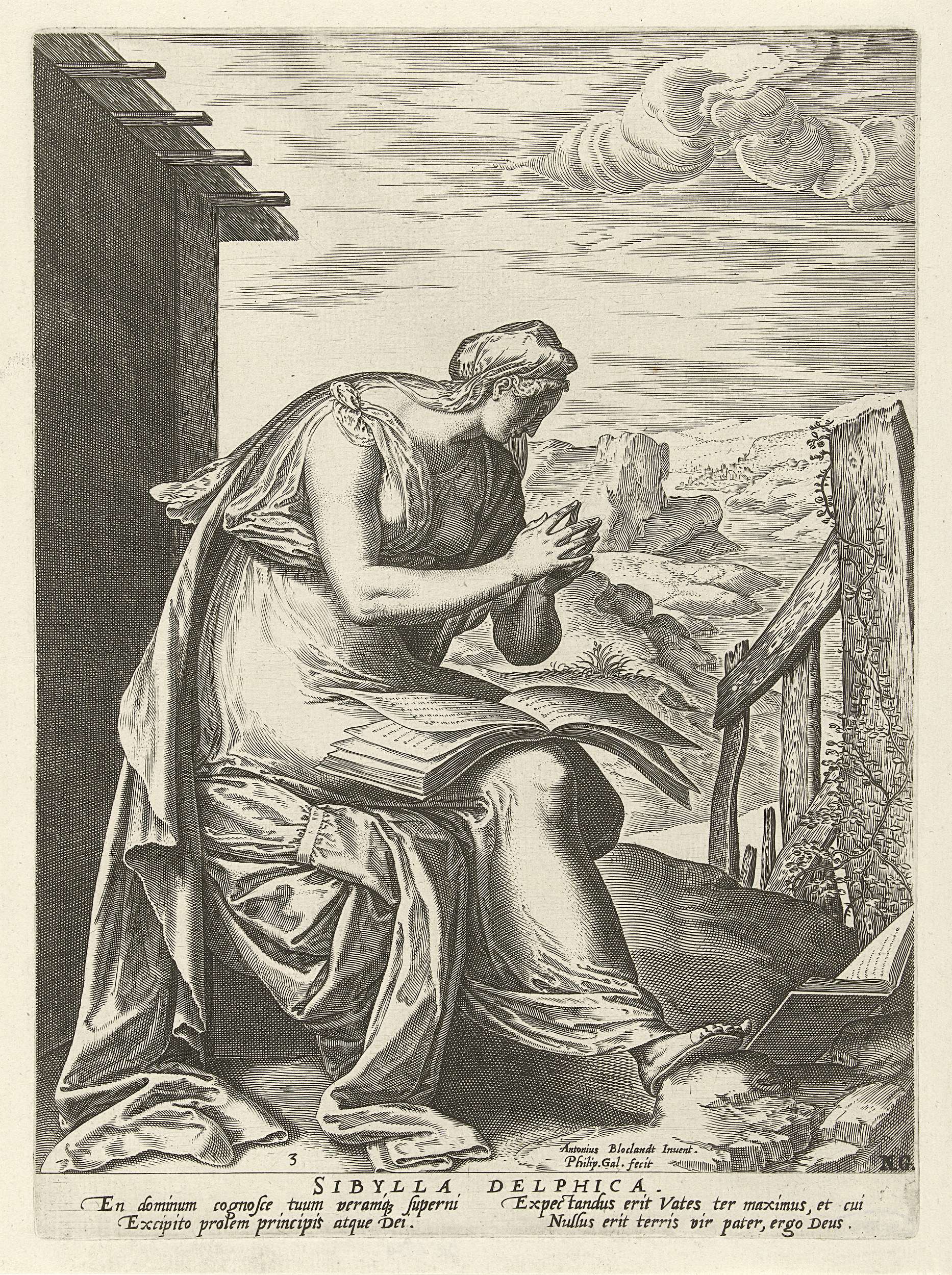 De Delfische Sibille zit op een stoel. Op haar schoot een open boek. De prent heeft een Latijns onderschrift en maakt deel uit van een tiendelige serie over de Sibillen.