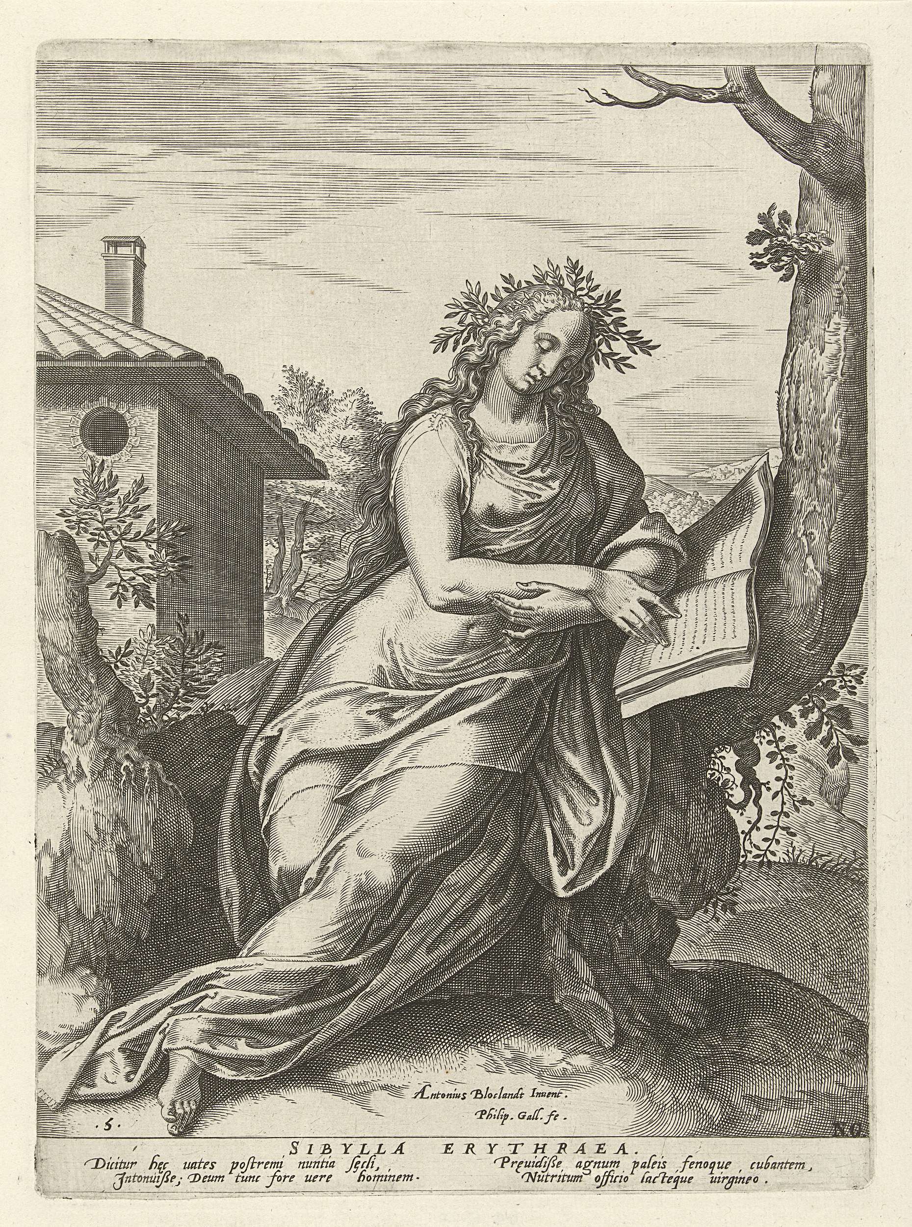 De Sibille van Erythrae, zittend op een boom. Ze leest een boek. De prent heeft een Latijns onderschrift en is deel van een tiendelige serie over de Sibillen.