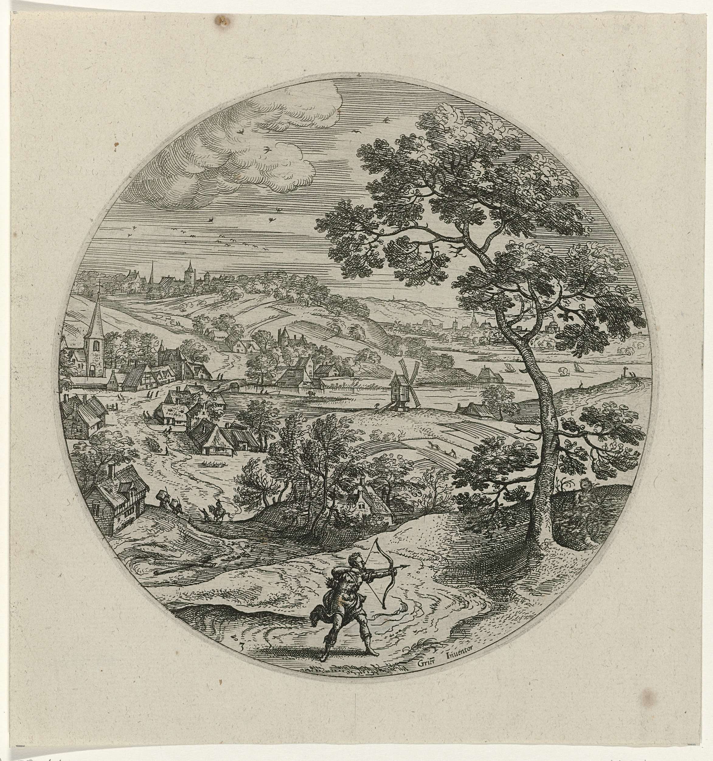 Cephalus is op jacht. Procris heeft zich verscholen achter een struik. Nietsvermoedend spant Cephalus zijn boog . De prent is deel van een serie over het mythologische verhaal van Procris en Cephalus.